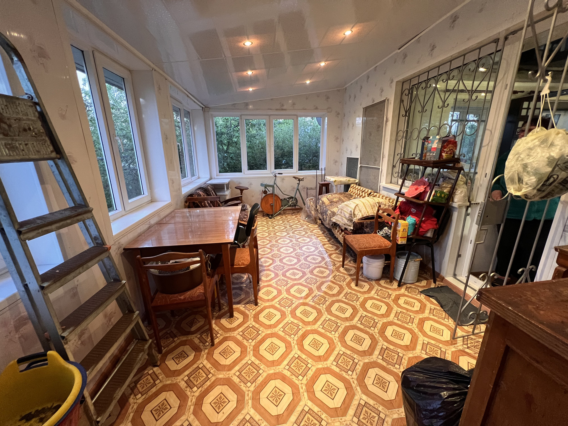 Потолок: натяжной потолок, над ним утепленные керамзитом деревянные балки.