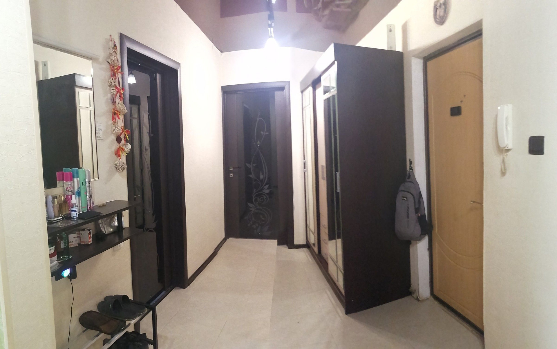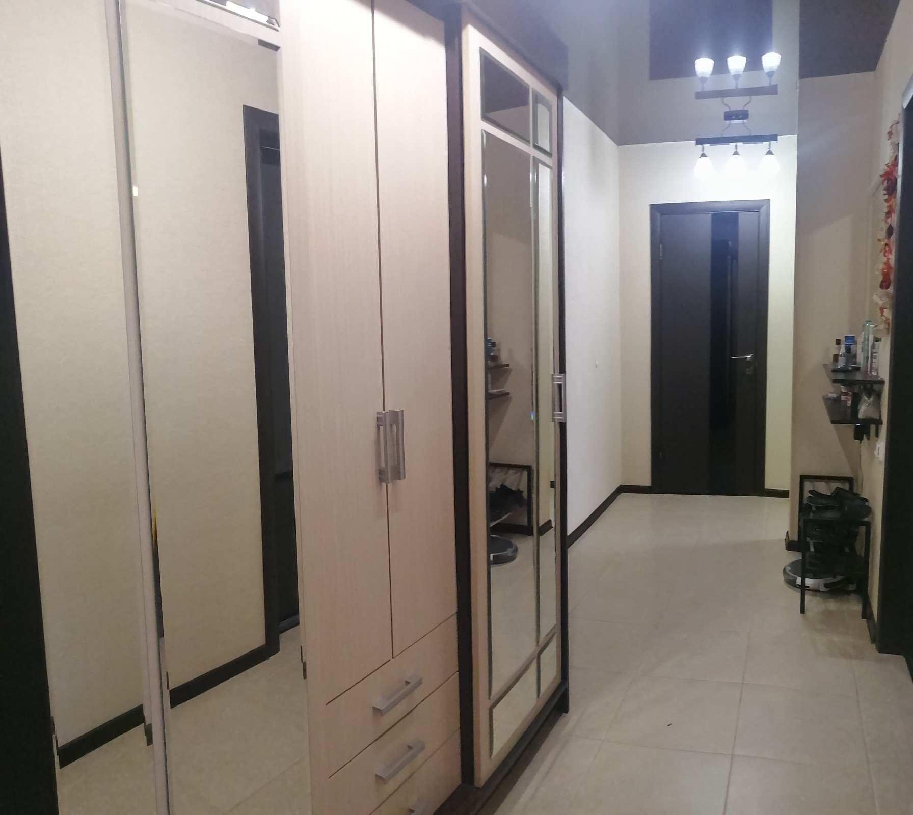 Натяжные потолки, керамогранит- коридор и кухня (летом прохладно, зимой можно включить теплый пол). Ширина комнат 3,5 метра.