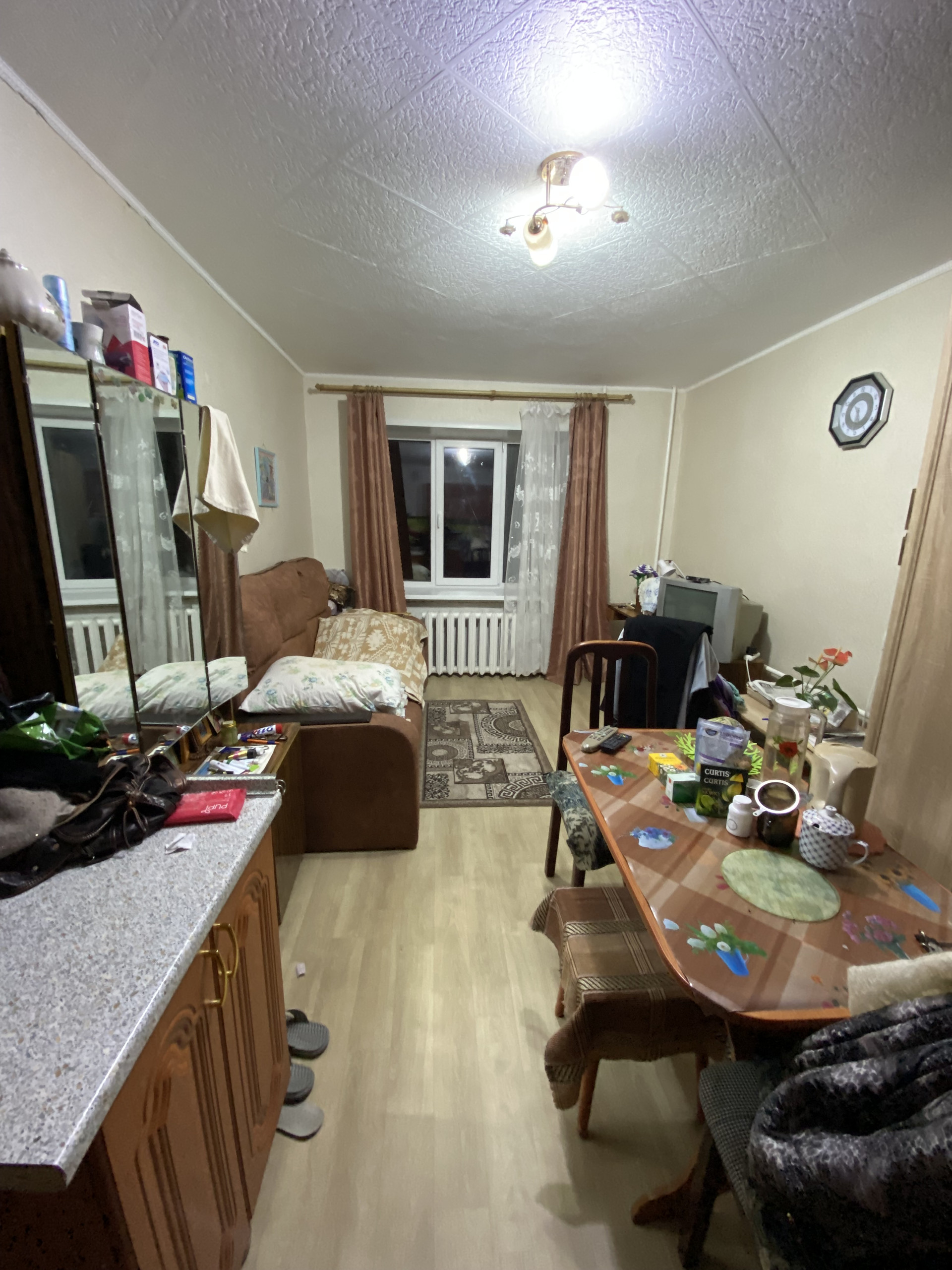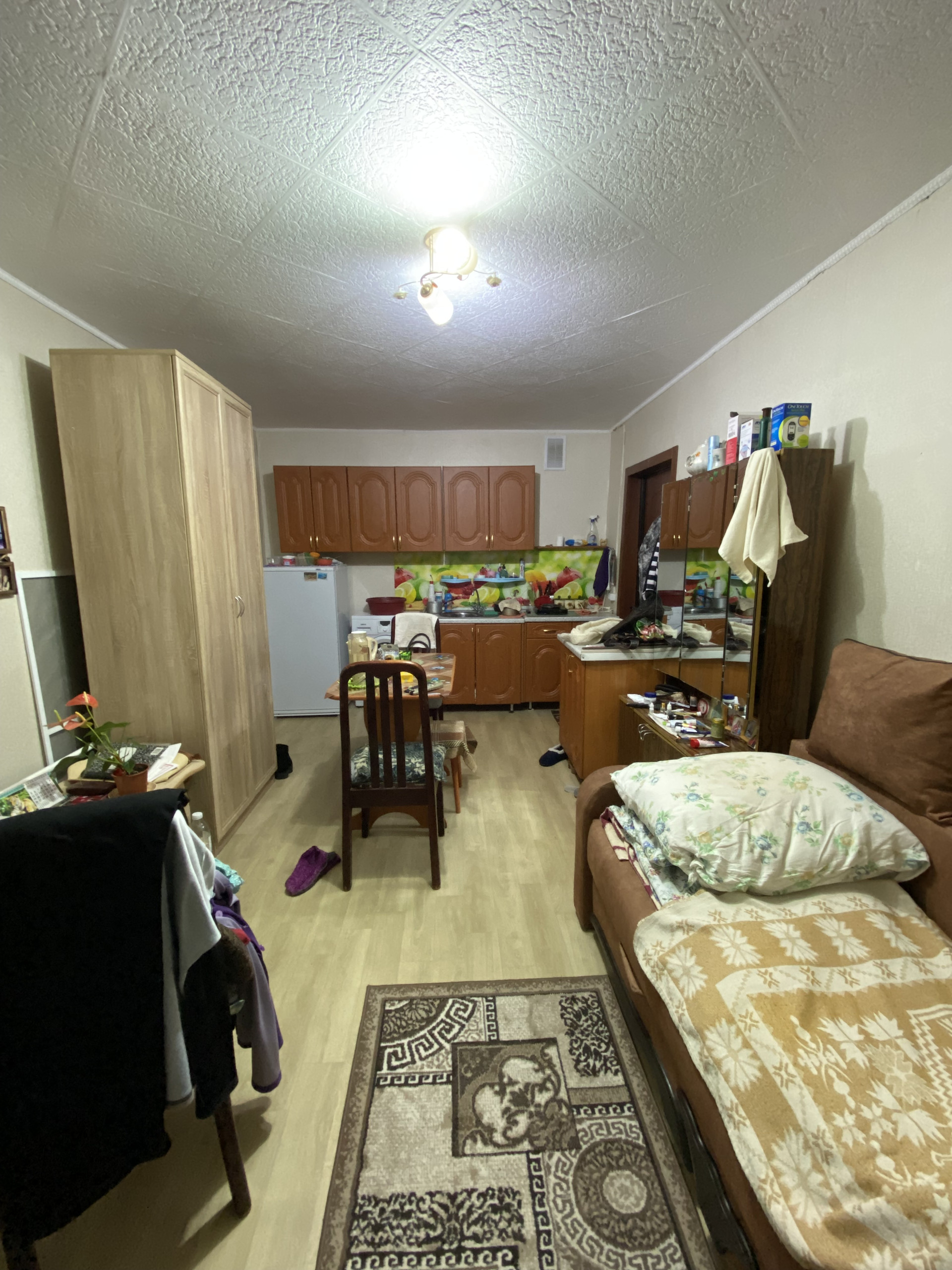 район электроконтакт, очень теплая,вода проведена в комнату и готовить в комнате, есть вытяжка, душ и туалет отдельно на две комнаты, окна ПВХ, на полу ленолиум , соседка очень хорошая женщина ,в нашем крыле чисто и все запирается.Остановка , магазины, школа,садик все в шаговой доступности.Документы готовы к сделке.Один взрослый собственник.