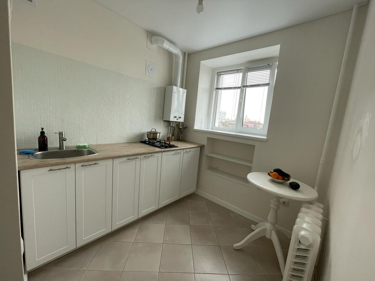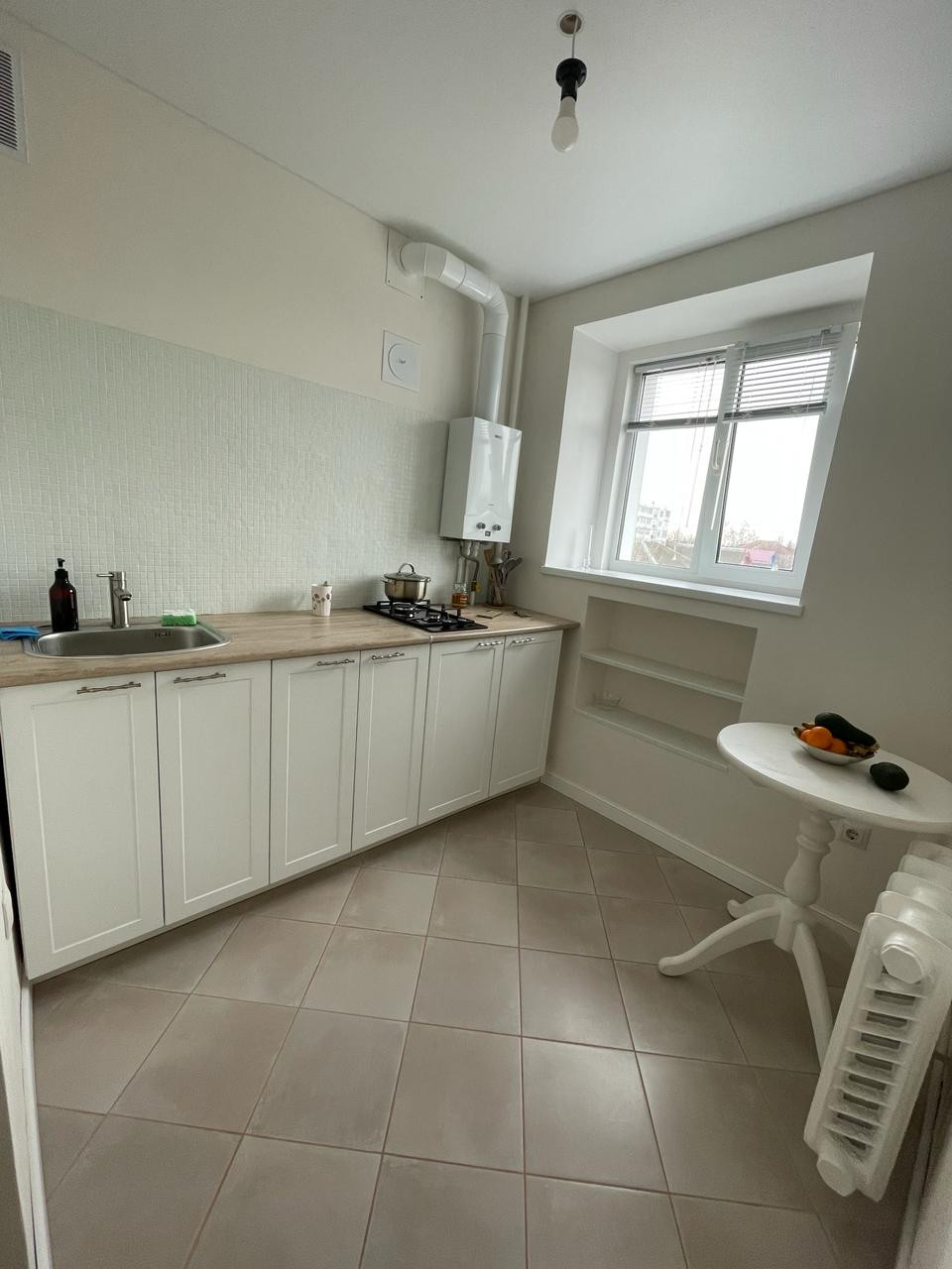 В коридоре и на кухне на полу кафель , потолки натяжные.
