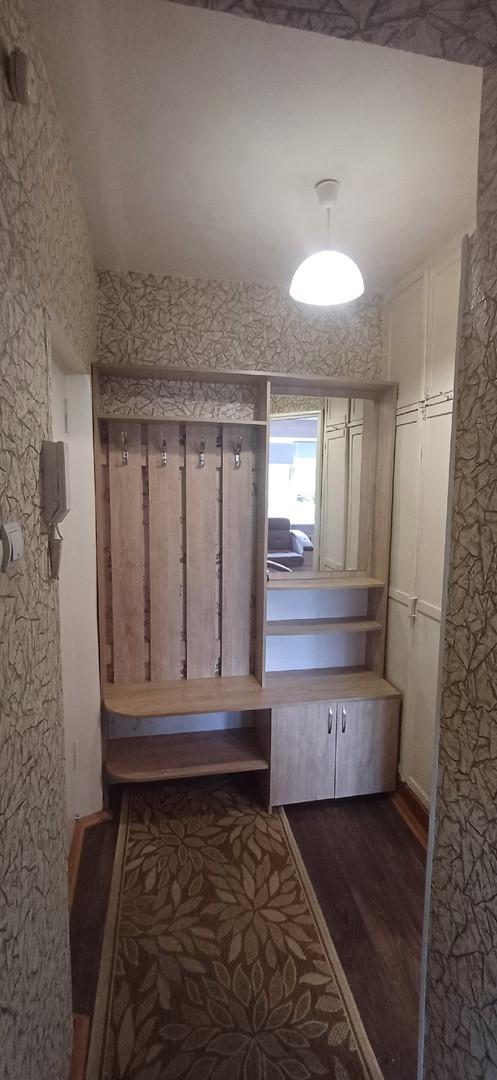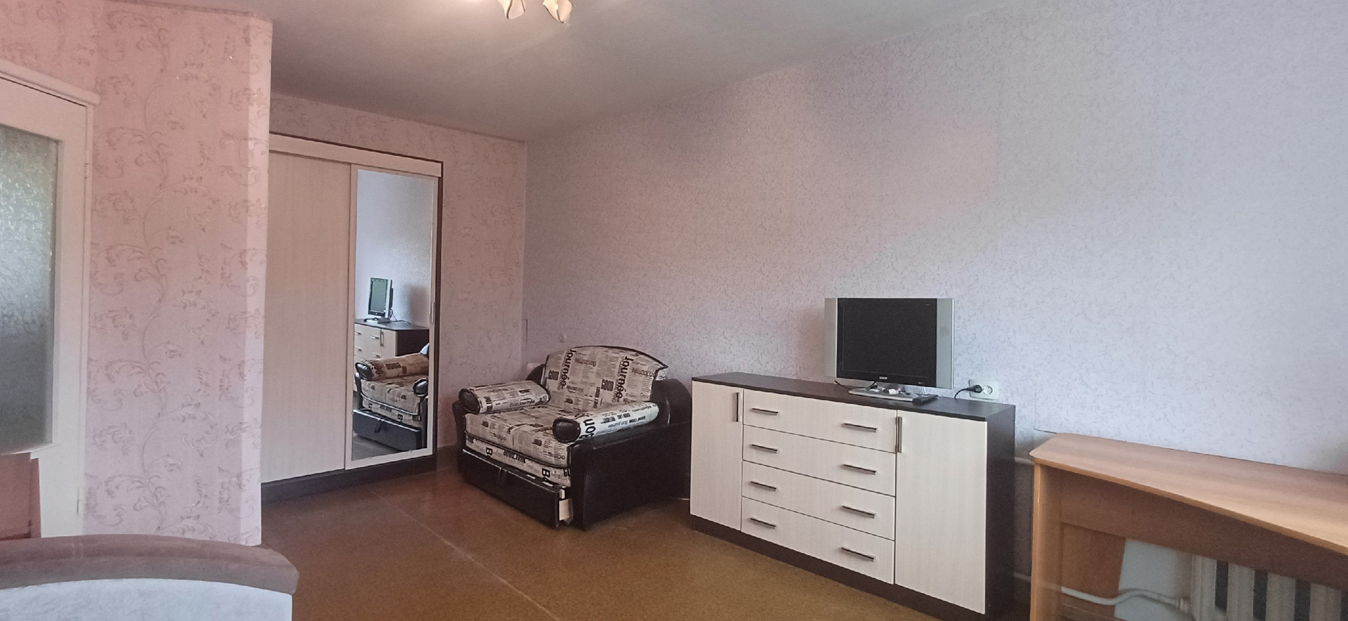 Жилая площадь составляет 18 квадратных метров, а кухня занимает 5.4 квадратных метра. В квартире выполнен косметический ремонт. Пол бетонный, покрыт линолеумом. Санузел совмещенный. Из окон открывается вид на тихий и ухоженный двор.