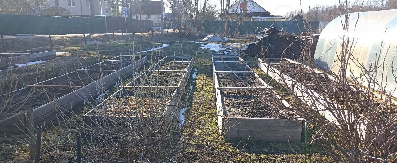 На участке растут плодовые деревья (яблони, сливы), ягоды (смородина, крыжовник, малина, клубника), теплица 3х10, имеются высокие грядки из дерева 1х8 метров 7шт.