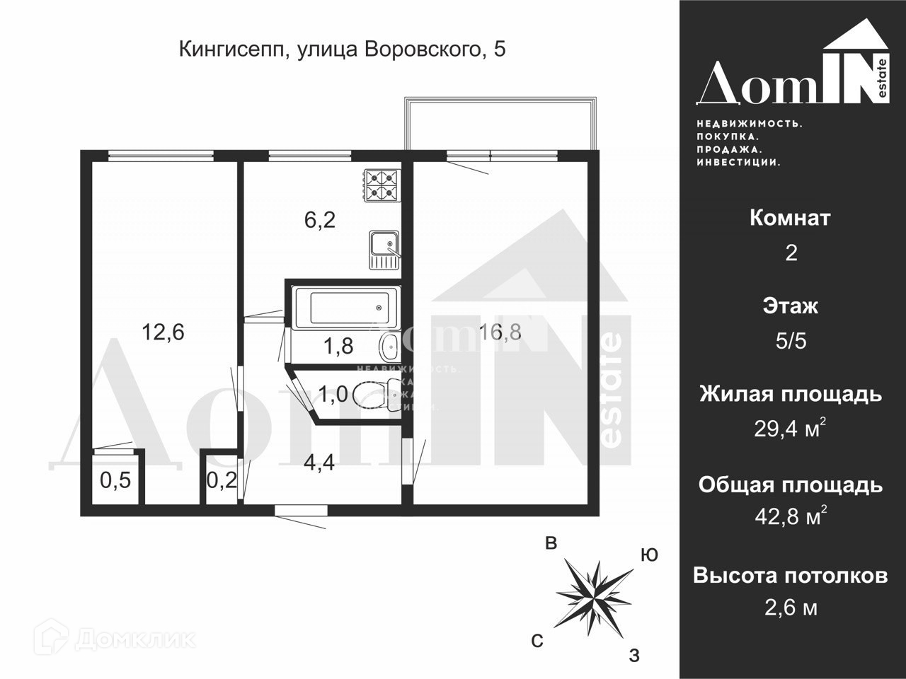 2-комнатная квартира, 42.8 м2, этаж 5 / 5, на продажу в Кингисеппе, улица Воровского, 5