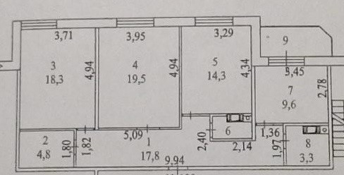 Общая площадь 89,2 м2, кoмнaты 18,5 + 19,5 + 14,3 м2, куxня 9.6 м2, коридоp 9.7 м2, санузел раздельный 3.3 м2 + 2.2 м2, застекленный балкон.