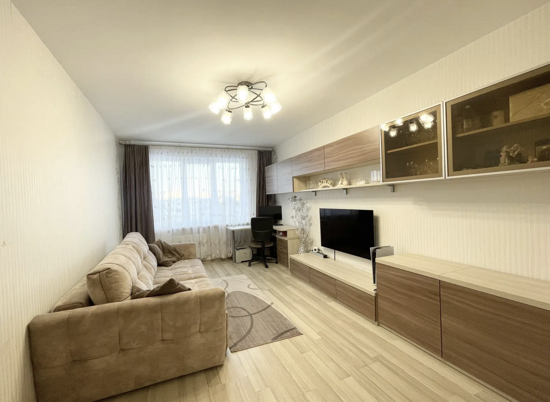 Квартира имеет продуманную планировку: жилая площадь составляет 31.2 квадратных метра, а кухня — 9.1 квадратных метров. В квартире выполнен косметический ремонт, благодаря чему новым владельцам не потребуется вкладывать дополнительные средства в обновление интерьера. Комфортное проживание обеспечивает раздельный санузел и наличие балкона, откуда открывается вид на тихий и зелёный двор.