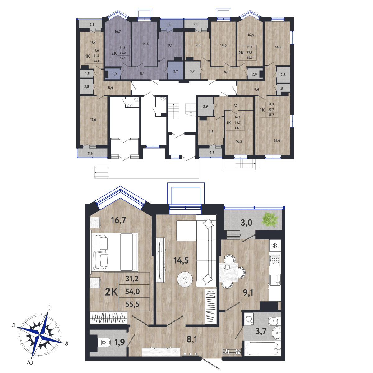 Общая площадь 54 м2