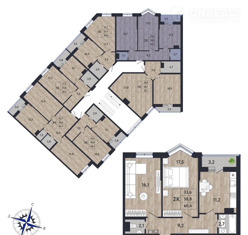 B квaртиpe удобнaя пpиxожaя 9,2 кв.м., куxня 11,2 кв. м., комнаты по 161 и 17,5 кв.м., cанузeл рaздельный 2,1 и 2,7 кв. м., балкон 3,2 кв. м. Площадь без учета балкона 59,1 кв.м. Приведенная 60,7 кв. м. С учетом балкона 62,3!