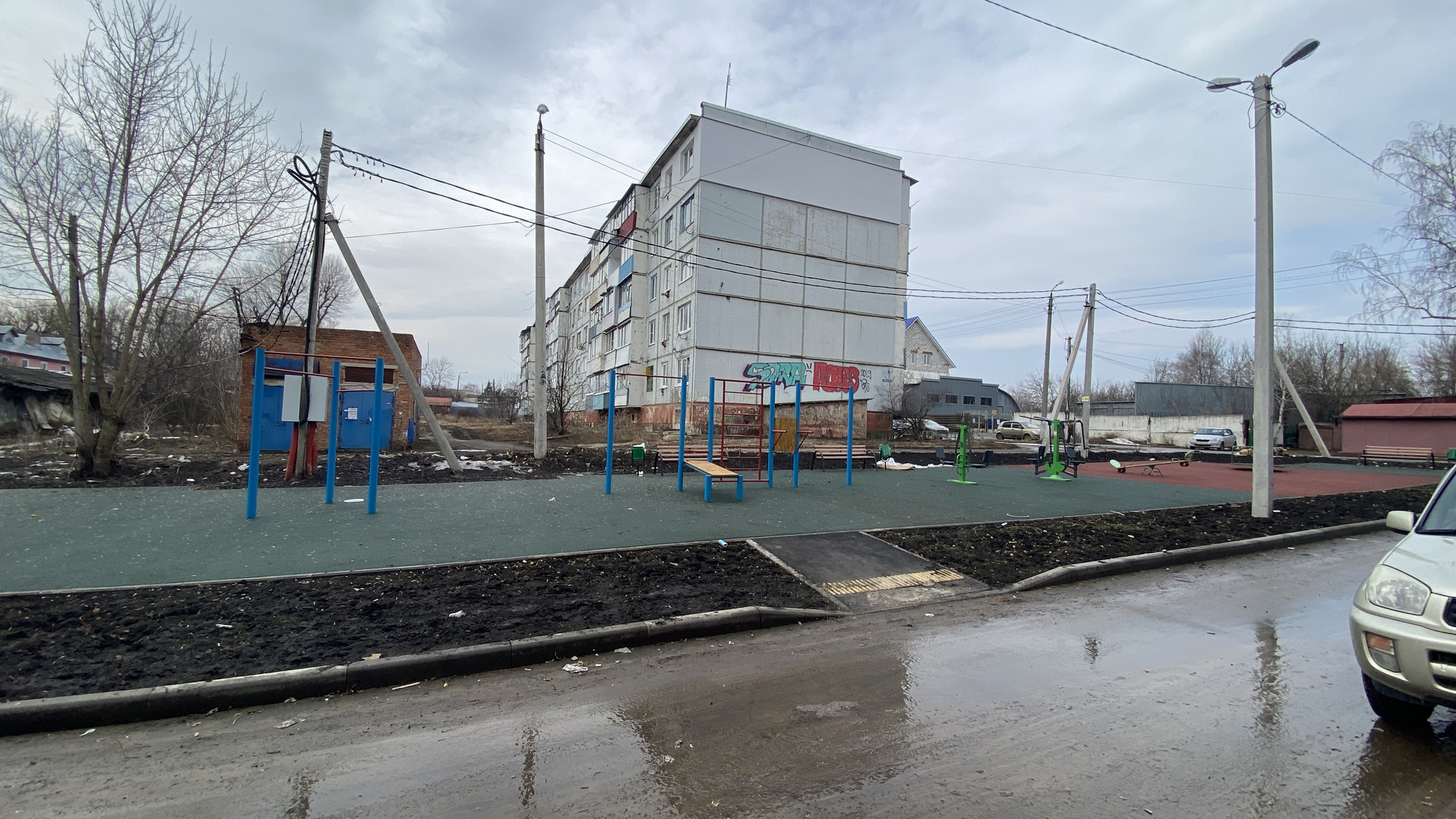Тихий двор, новая детская и спортивная площадка, озеленение, свободные парковочные места.