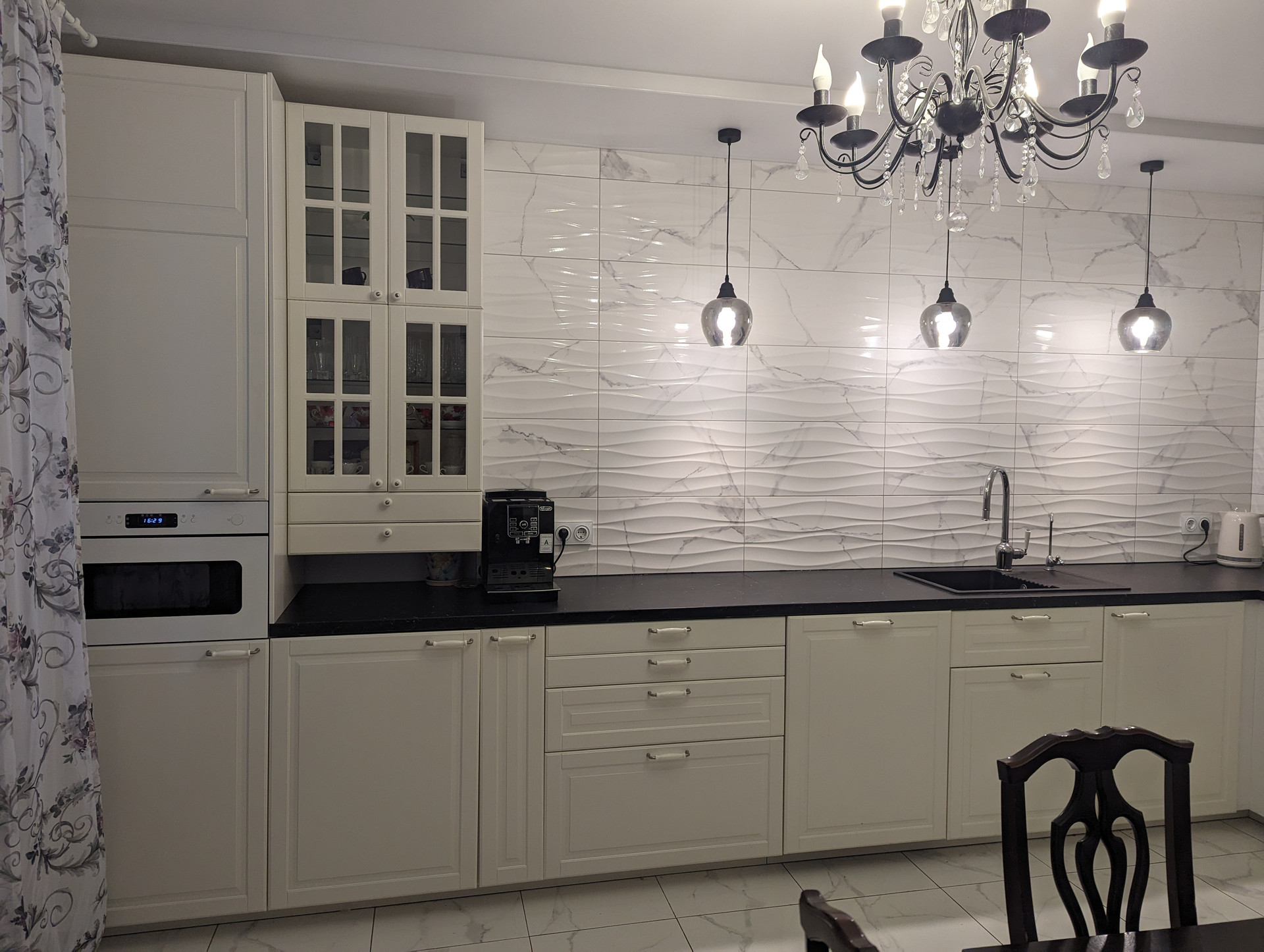Остаётся кухонный гарнитур, со встроенной техникой ИКЕА: морозильник, холодильник, индукционная варочная панель, электрический духовой шкаф, вытяжка, посудомоечная машина, микроволновая печь.