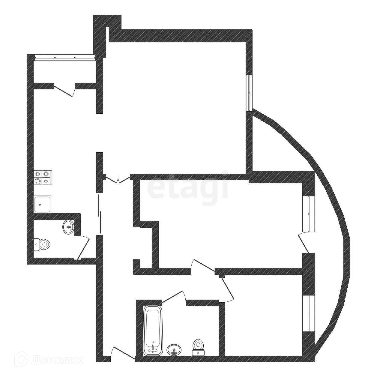 Комнаты изолированные 34 м2, 23 м2, 11.4 м2. Три балкона, выход на первый балкон из центральной комнаты, на второй балкон из средней комнаты, третий балкон в кухне.