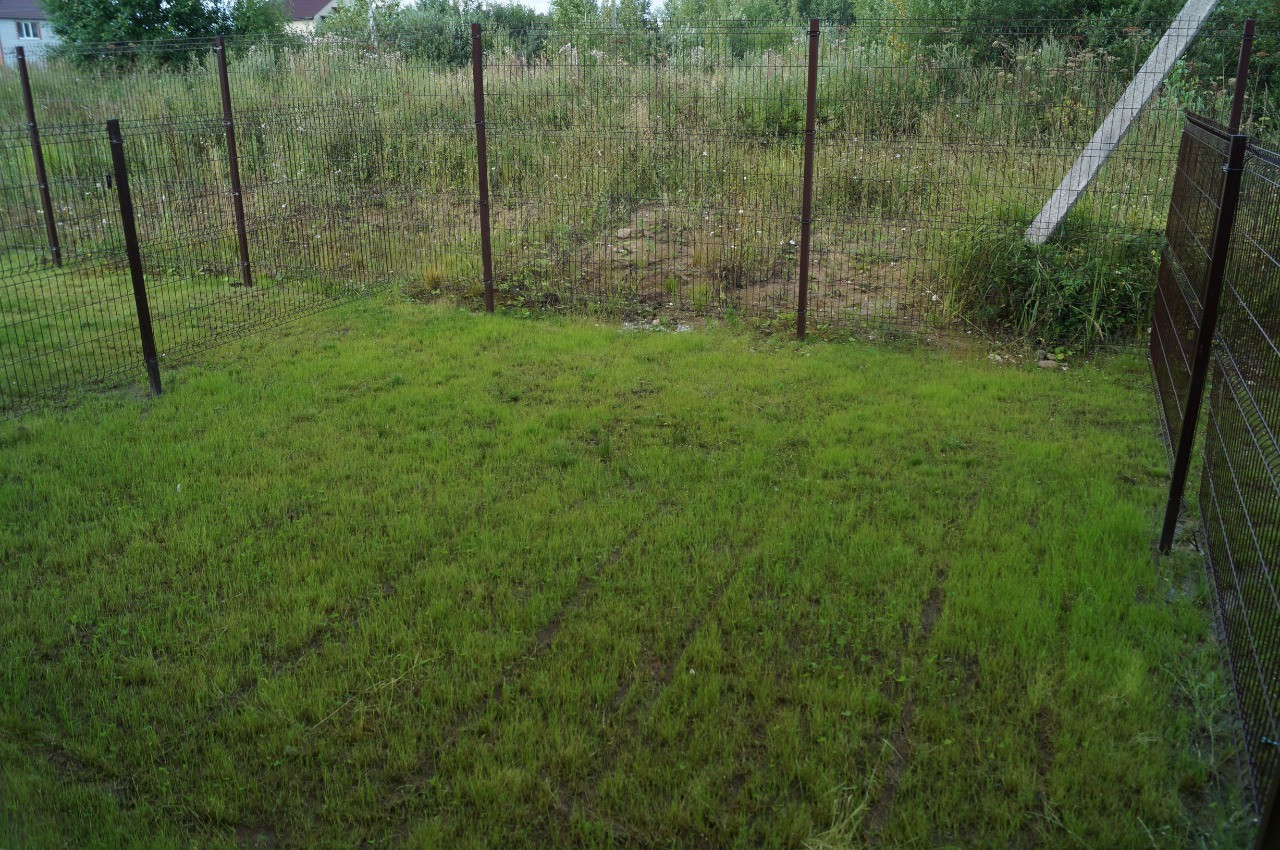 Чистая лужайка, без построек. Отгорожена забором.