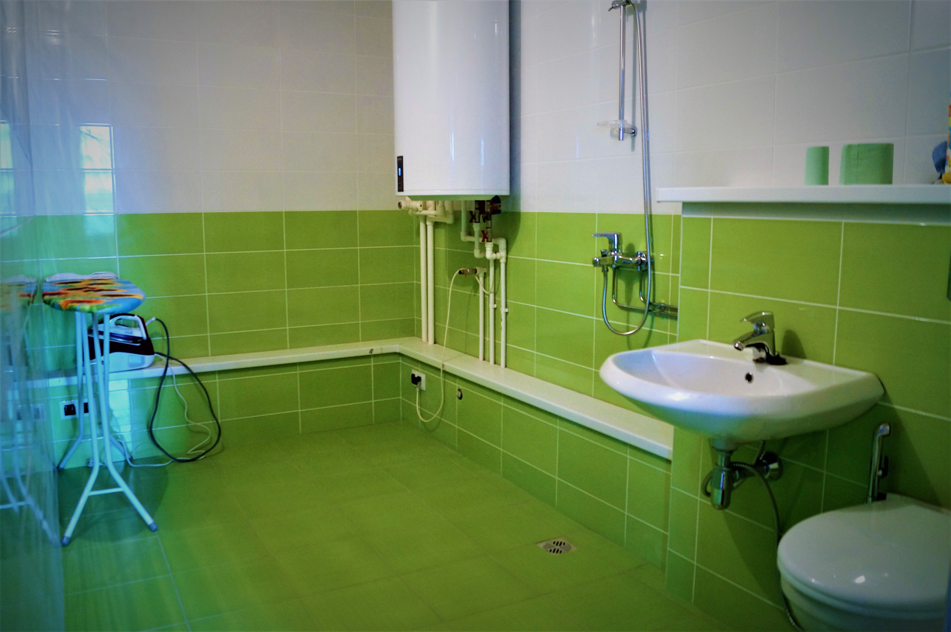 На каждом этаже по совмещенному с/у. На первом этаже большой, на втором с ванной, а на третьем с душем (для детей).