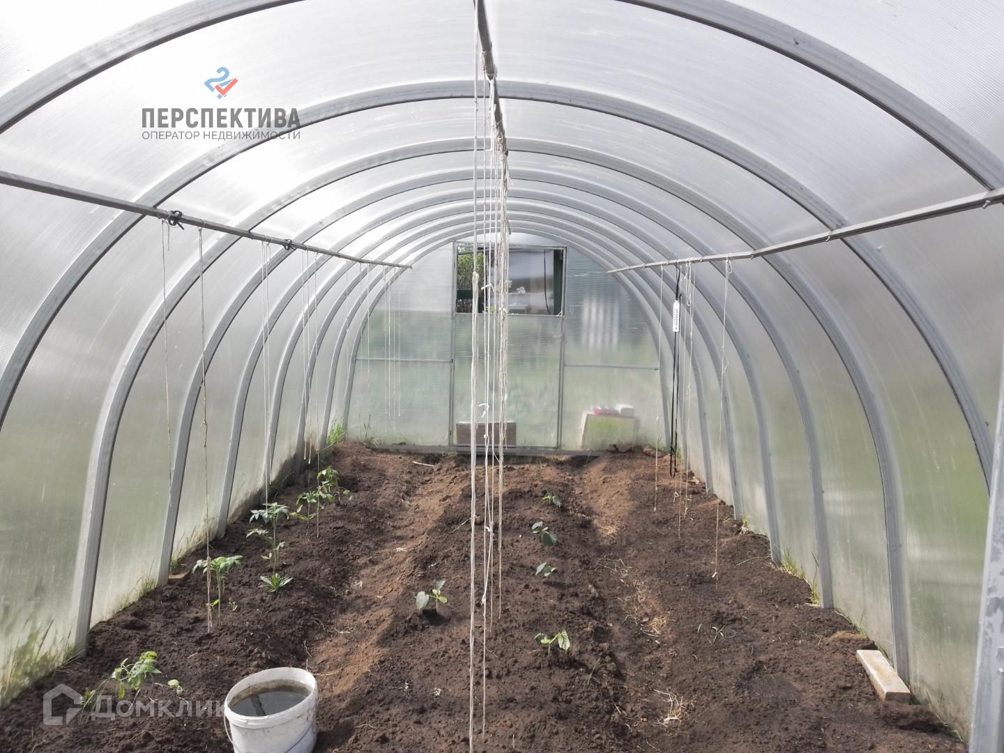 Из насаждений яблоня, смородина, малина, клубника. Есть теплица из поликарбоната. Ворота для заезда на парковку