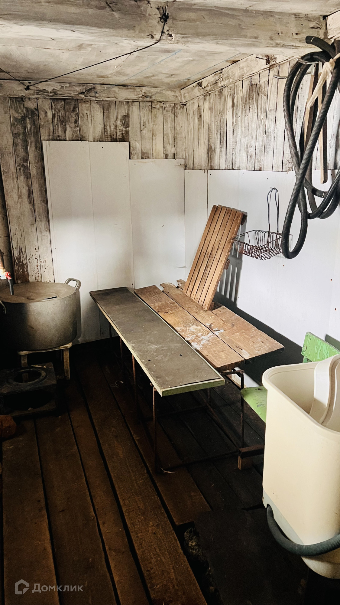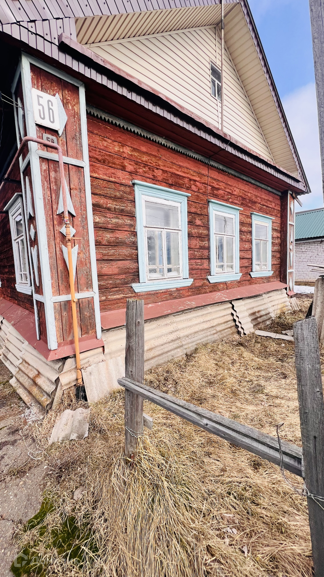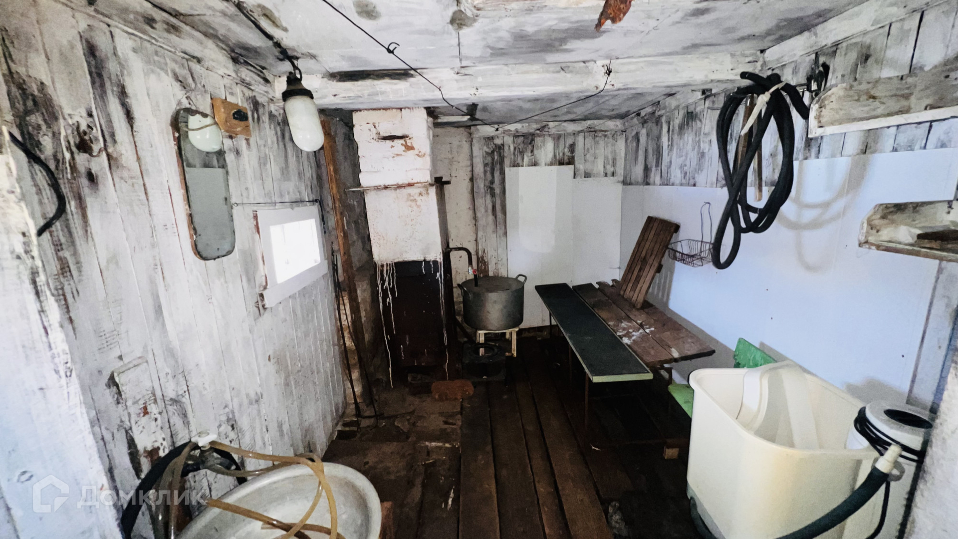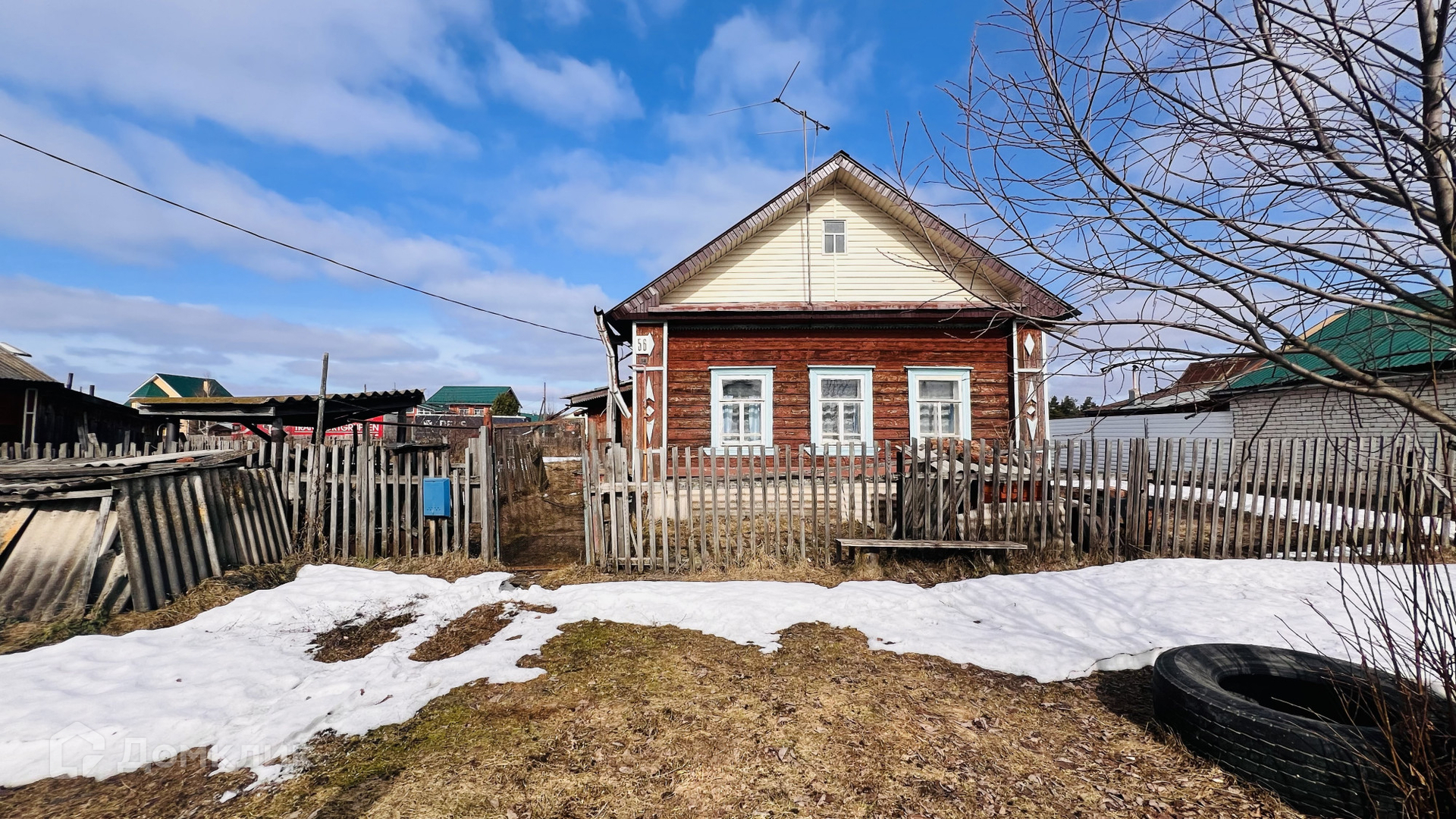 Дом деревянный, 1959 г.п. имеет 1 этаж, планировка дома по типу русской избы, можно определить количество комнат по своему усмотрению, сейчас здесь просторная комната, небольшое помещение и кухня, так же большая веранда с возможностью отопления ( есть печь)  сан узел холодный, есть дровяник и баня. Забор по периметру участка.