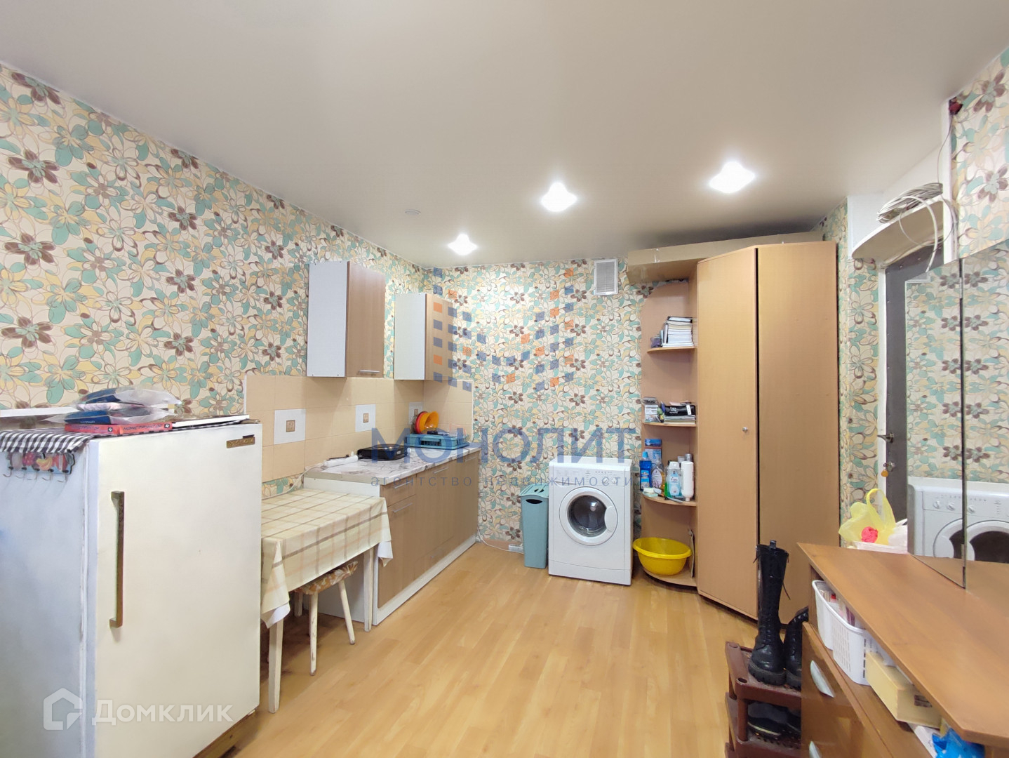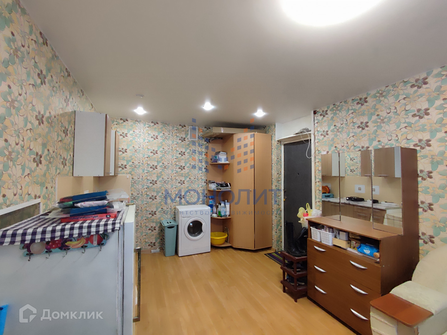 В комнате выполнен ремонт: покрытие пола линолеум, установлено пластиковое окно, натяжной потолок, свежие обои. В комнате есть кухонная зона, установлен новый кухонный гарнитур и обеденный стол, холодильник, стиральная машина, шкаф, трюмо, диван.  Места общего пользования в хорошем состоянии: санузел раздельный, в душевой комнате сделан ремонт (кафельная плитка и дверь).