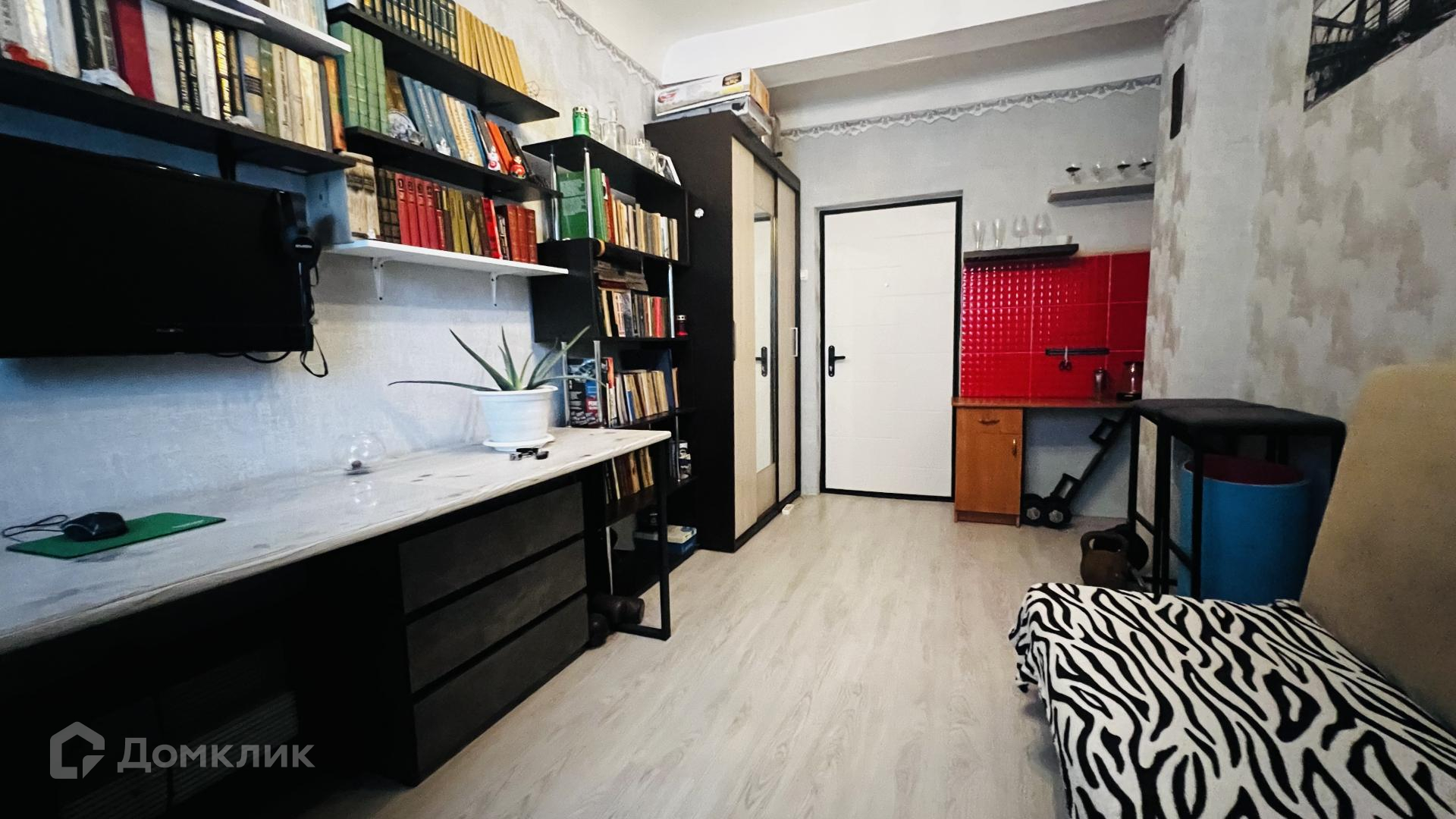 Остается вместительный шкаф-купе, барная стойка, диван, мебель на кухне.