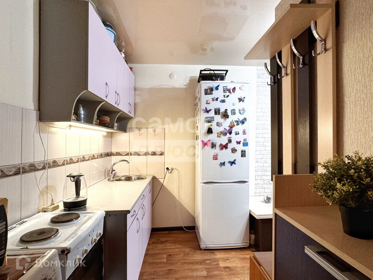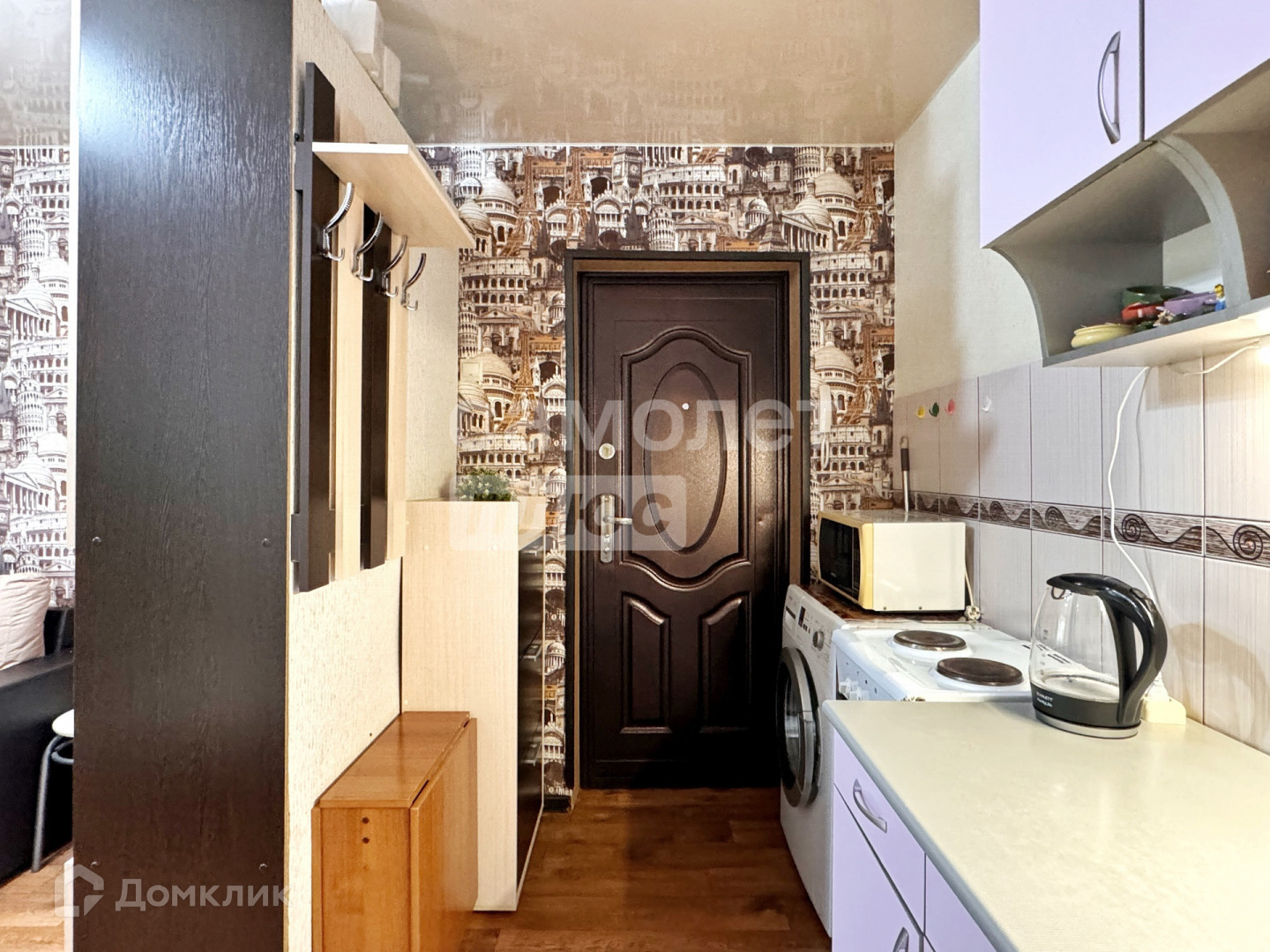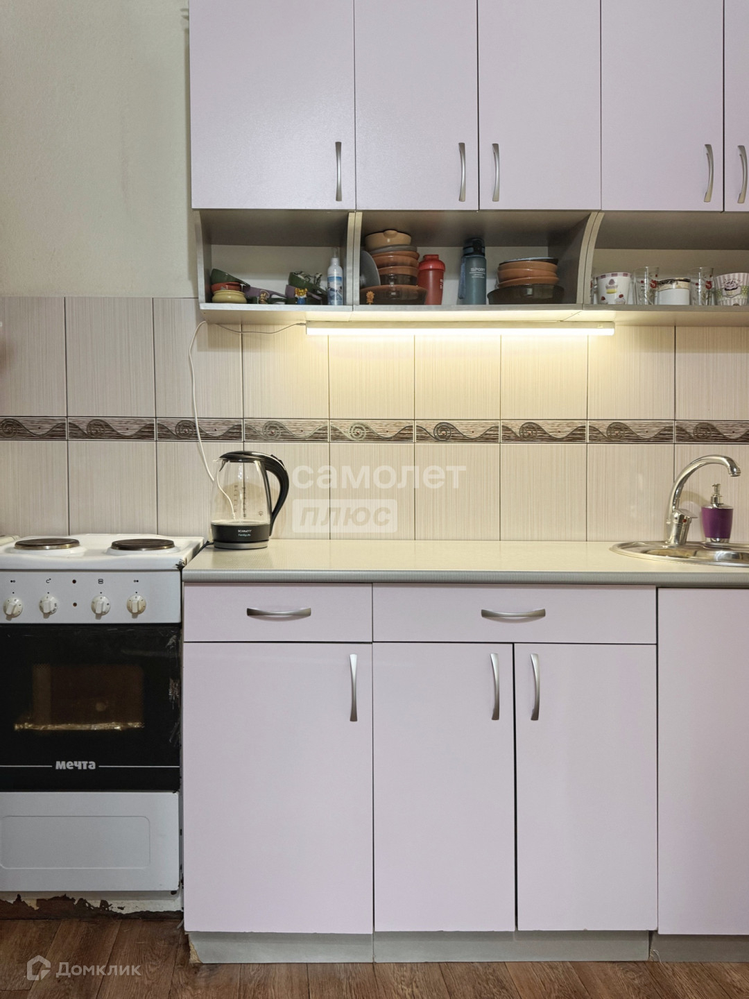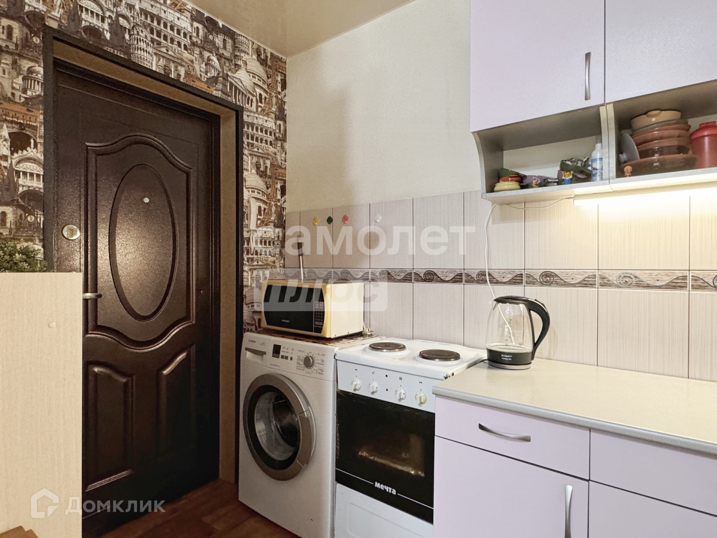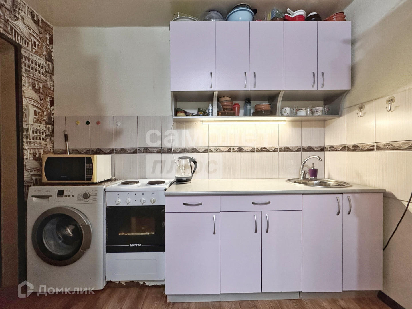 остается самое главное для проживания - кухонный гарнитур, диван, плита