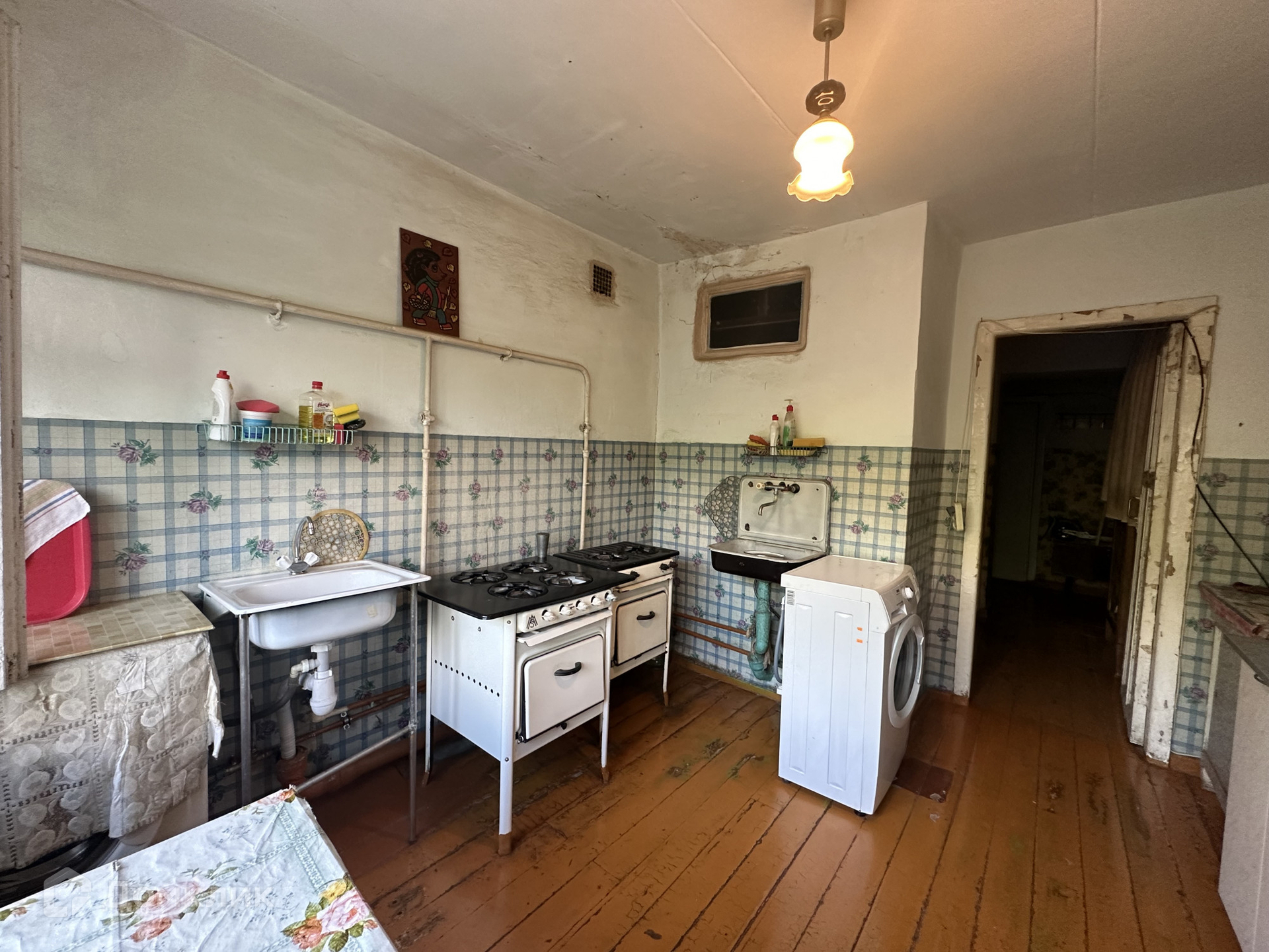 Остается вся мебель и бытовая техника: диван, стол, шкаф, холодильник, стиральная машина, плита.