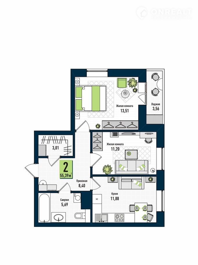 Общая площадь 56.4 м2