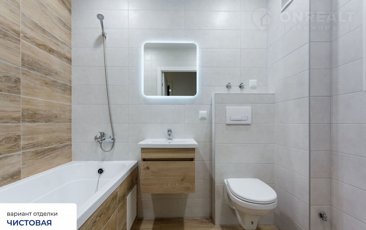 «Чистовая отделка» в трёх цветовых решениях – тёплая бежевая, классическая белая или современная серая и несколькими сериями плитки для ванной комнаты.