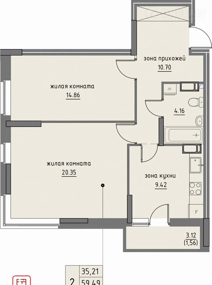 Жилая площадь 35.2 м2