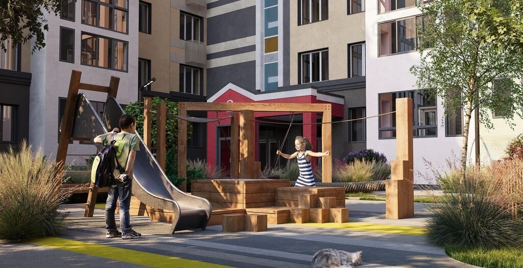 Каждый двор имеет уникальное наполнение: арт-объекты, релакс-зоны для взрослых и многофункциональные нейродинамические площадки для детей разных возрастов. Отдельно располагаются места для спокойного отдыха, паркинги и лужайки для выгула собак.
