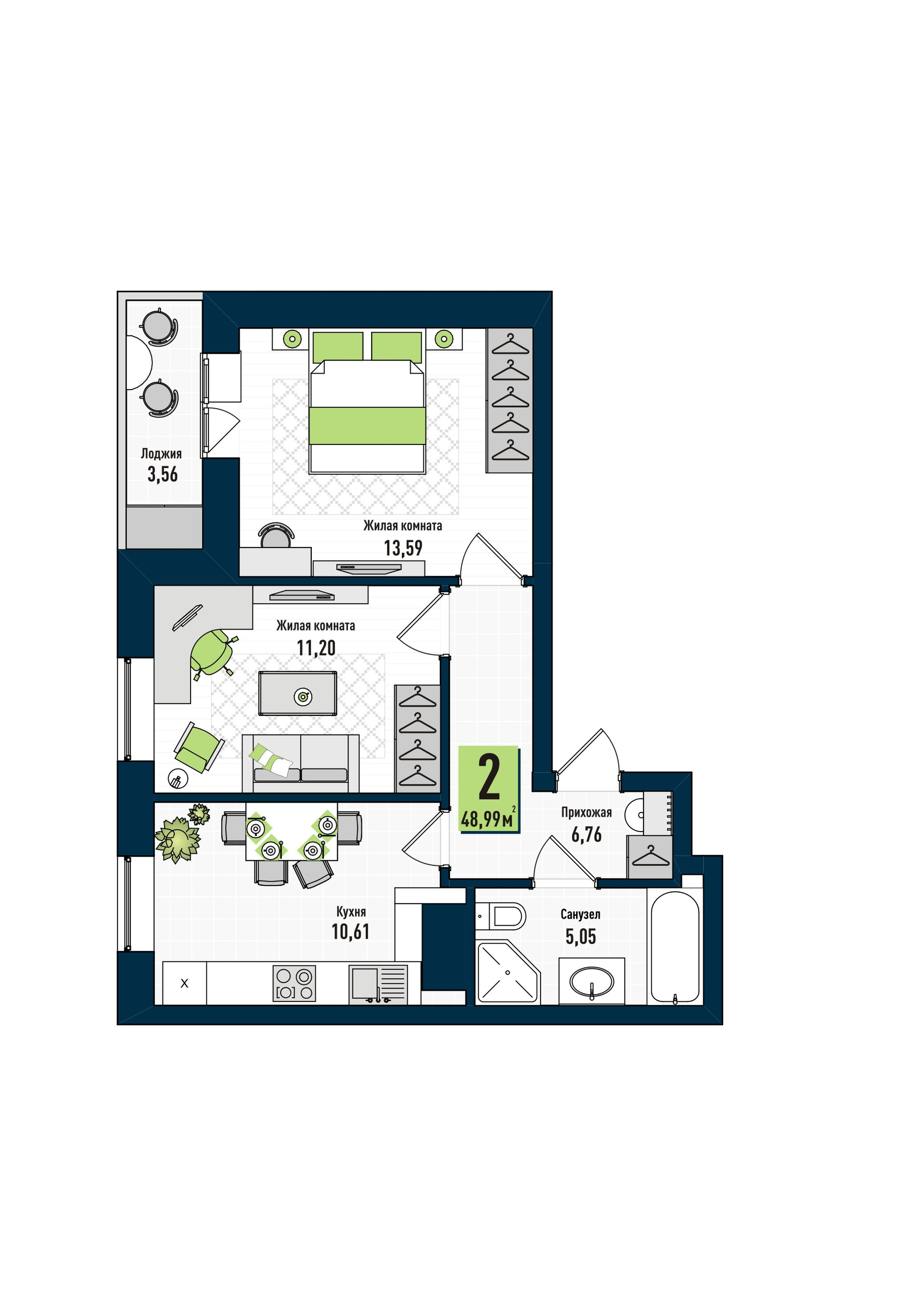 Площадь квартир варьируется от 34 до 68м2, а высота потолков 2,7м
