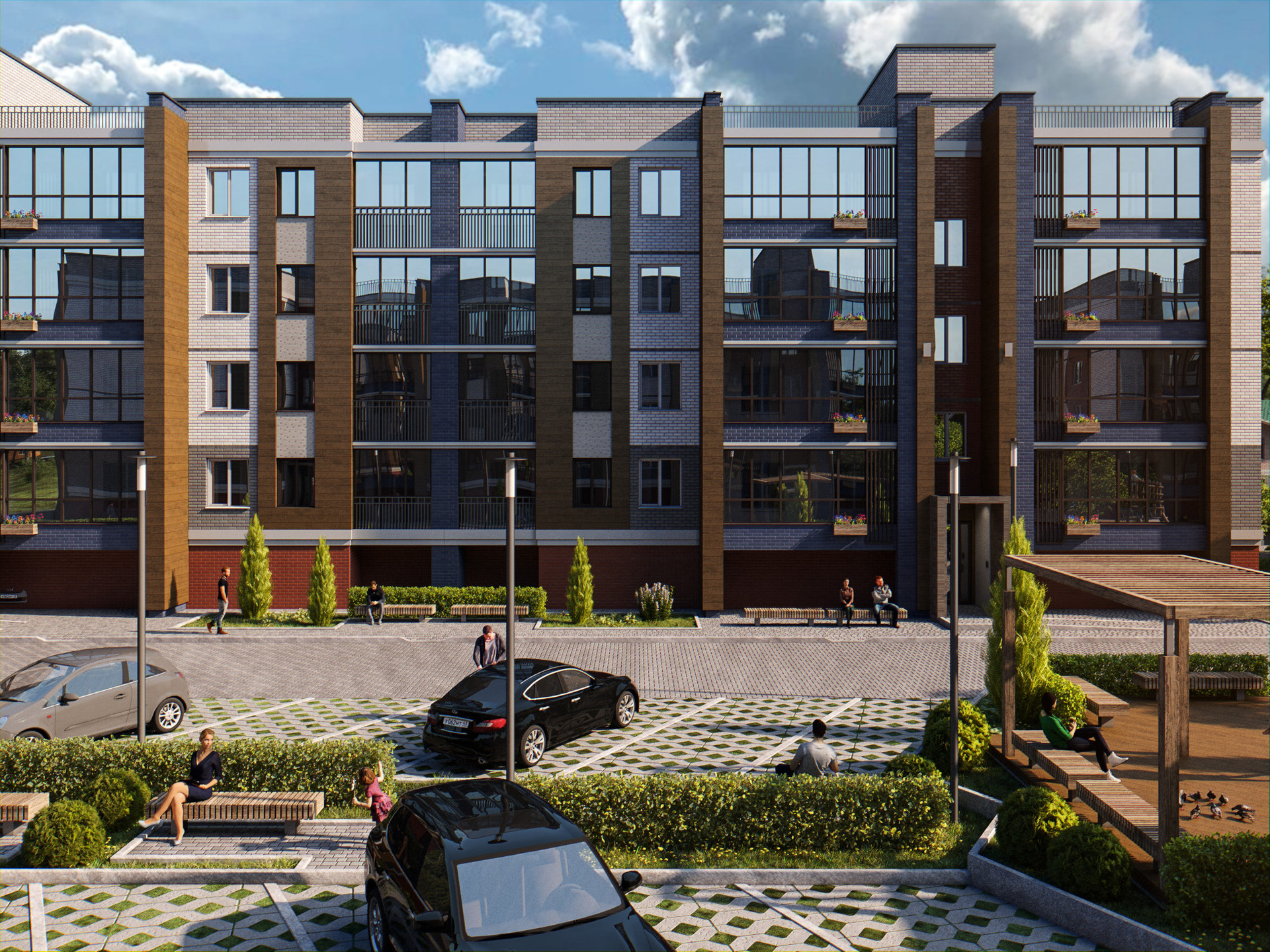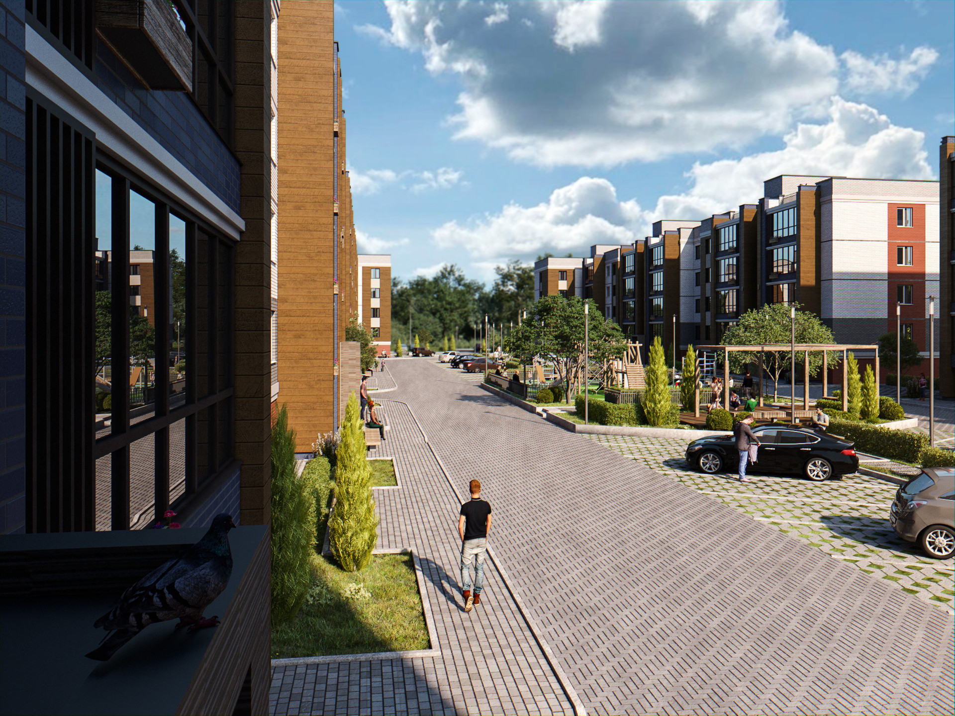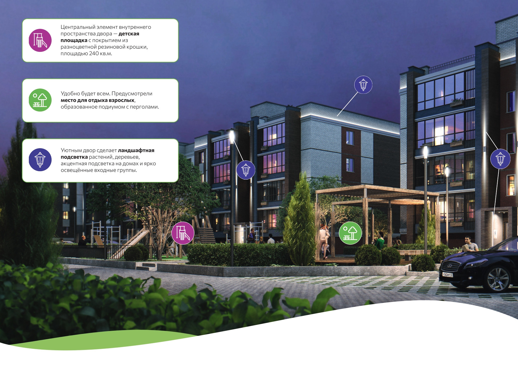 - Дома окружают благоустроенные дворы с безопасными детскими площадками.
