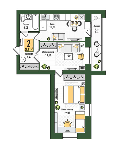 Общая площадь 58.91 м2