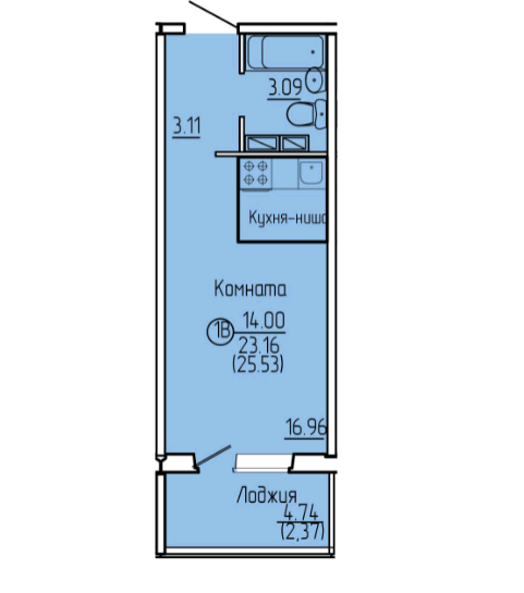 - площадь студии 23.2 кв.м плюс лоджия 4.74 кв.м;