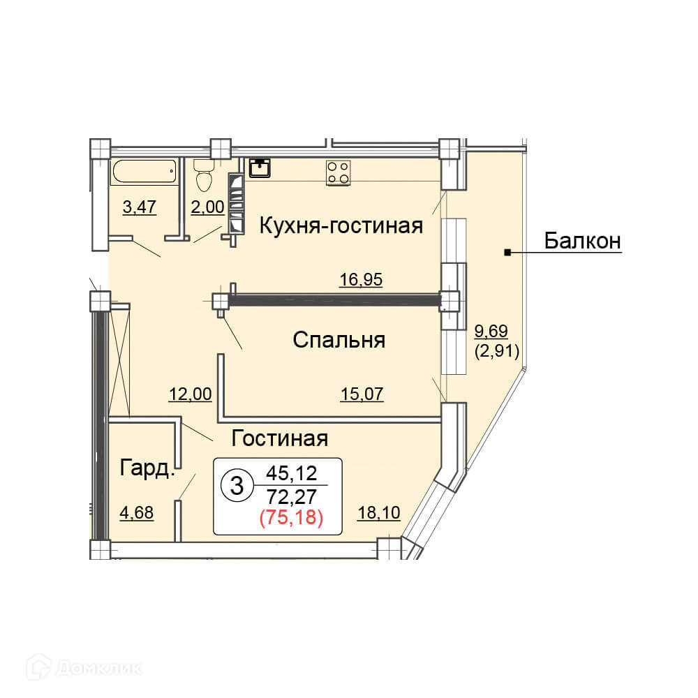комнаты:16,95квм/15,0квм7/18,10квм