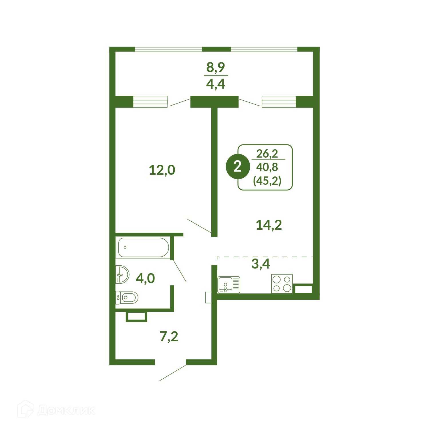 Общая площадь 45.2 м2