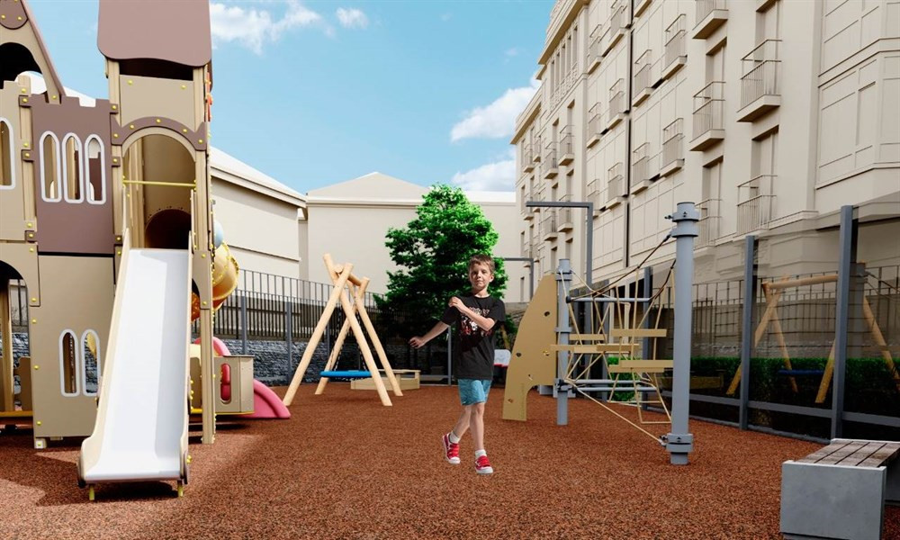- Для малышей 0-5 лет во дворе огороженная современная детская площадка с горками, качелями, песочницей и удобными скамейками.