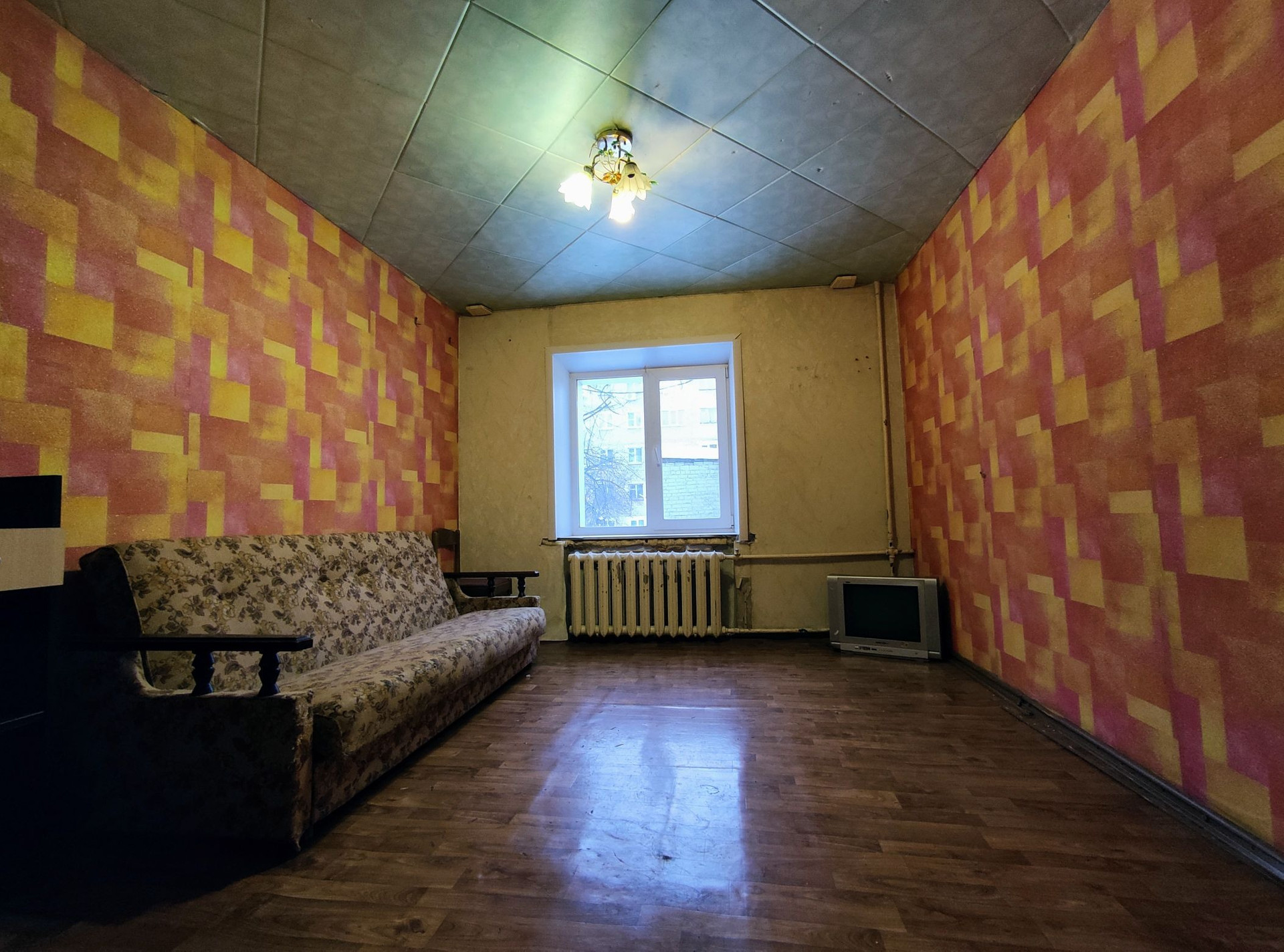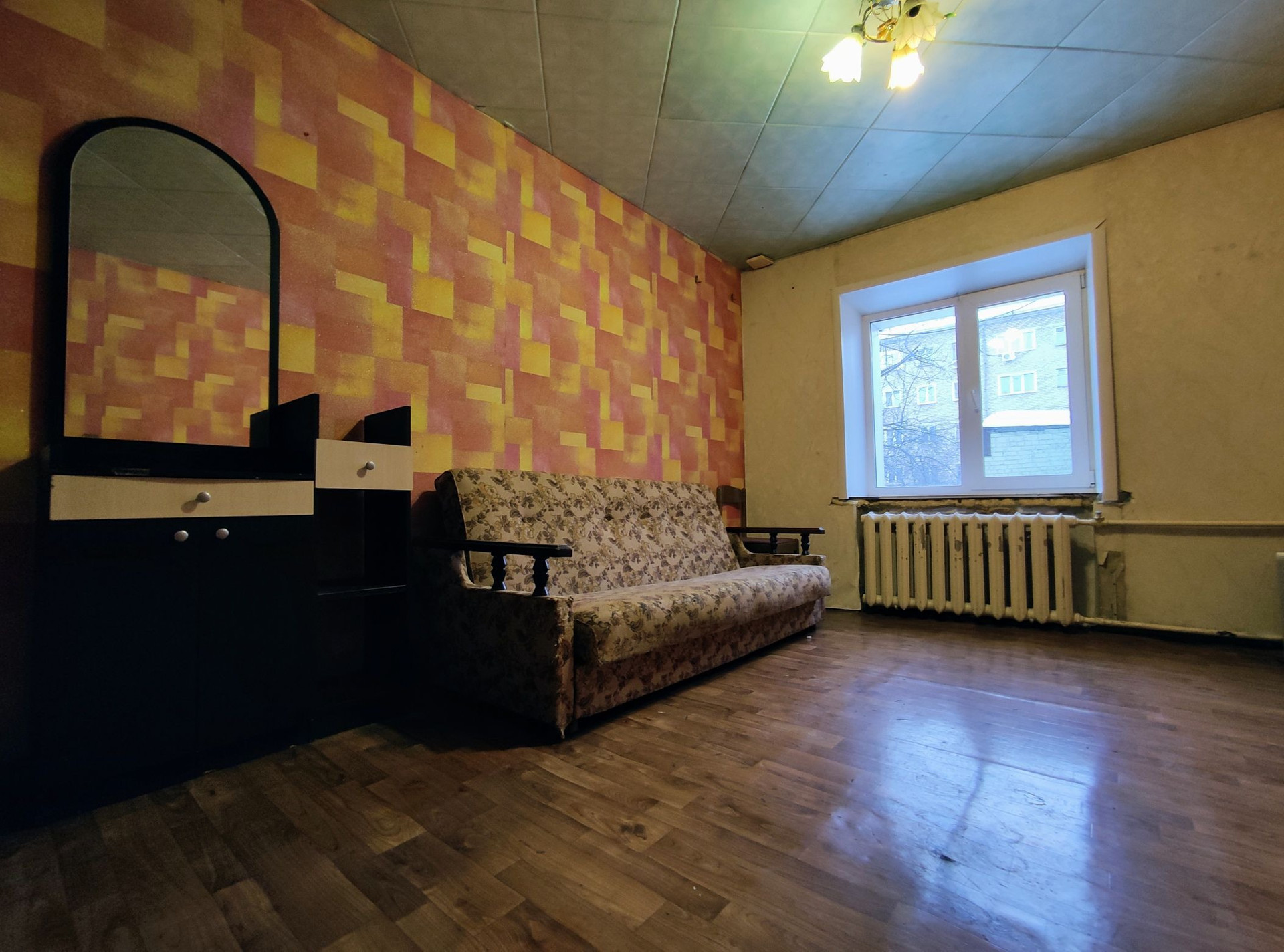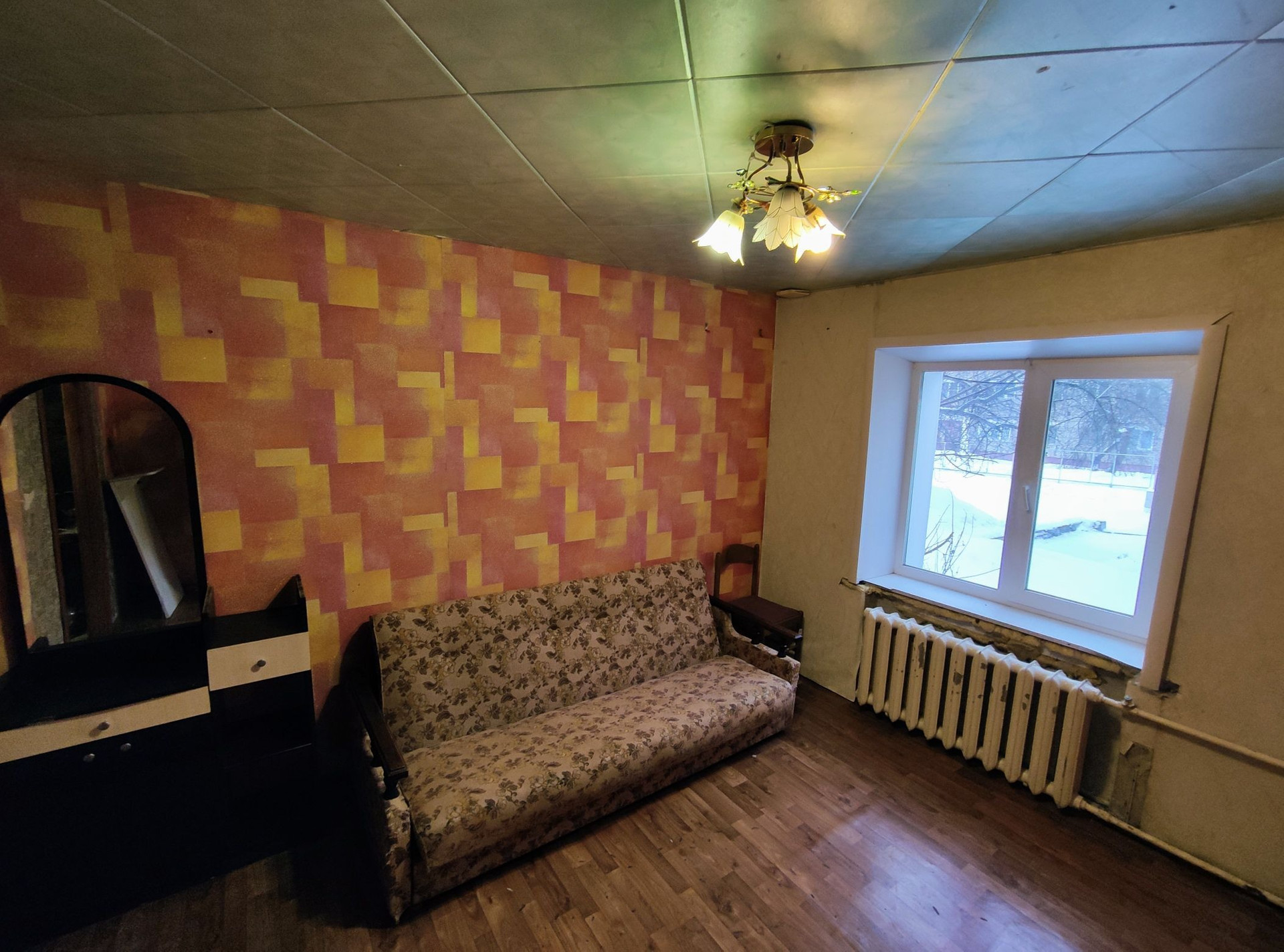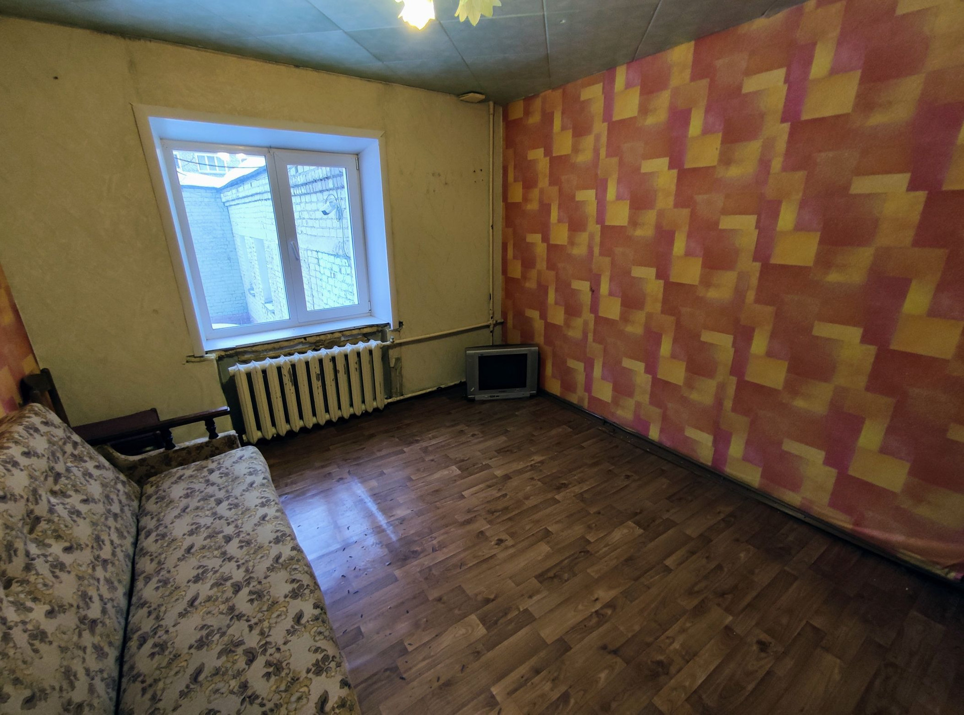 Квартира тёплая, светлая, не угловая. Высокий первый этаж. Окно пластиковое- во двор. Состояние жилое.