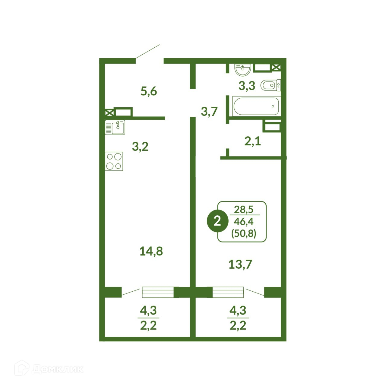 Общая площадь 50.8 м2