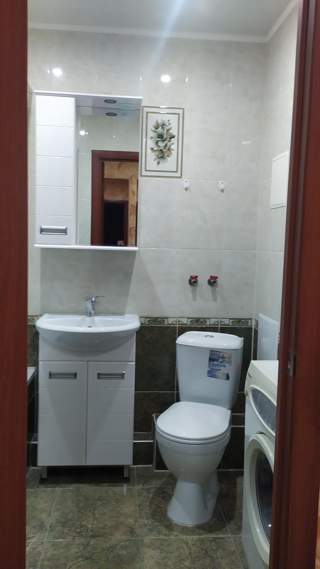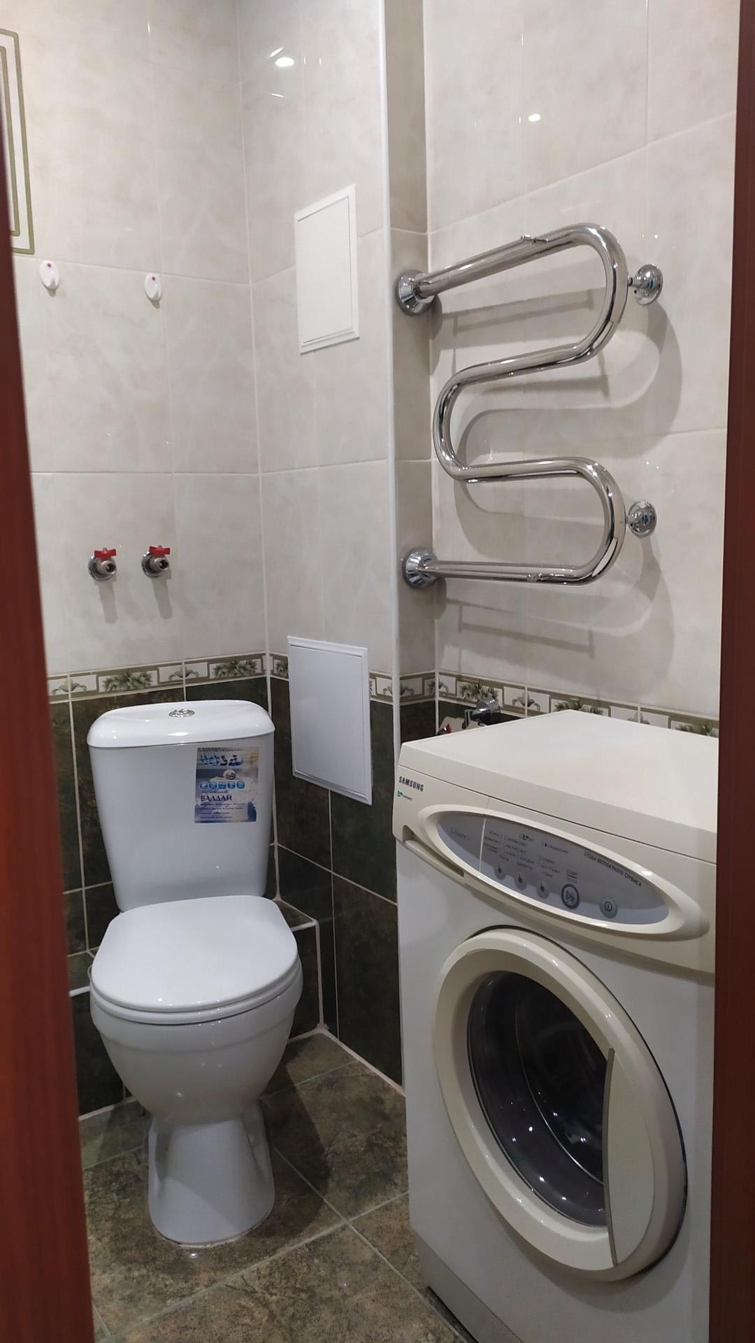 Санузел просторный, совмещённый в кафельной плитке, установлена стиральная машинка.