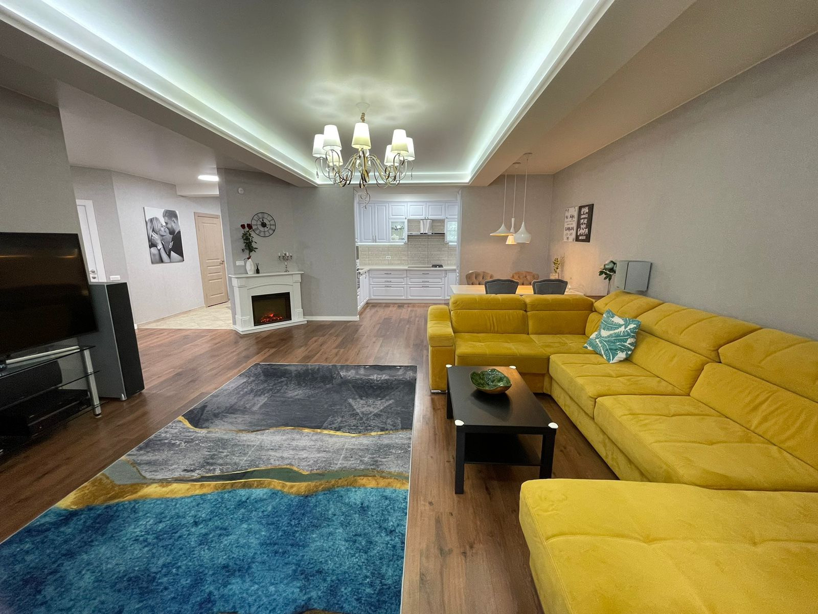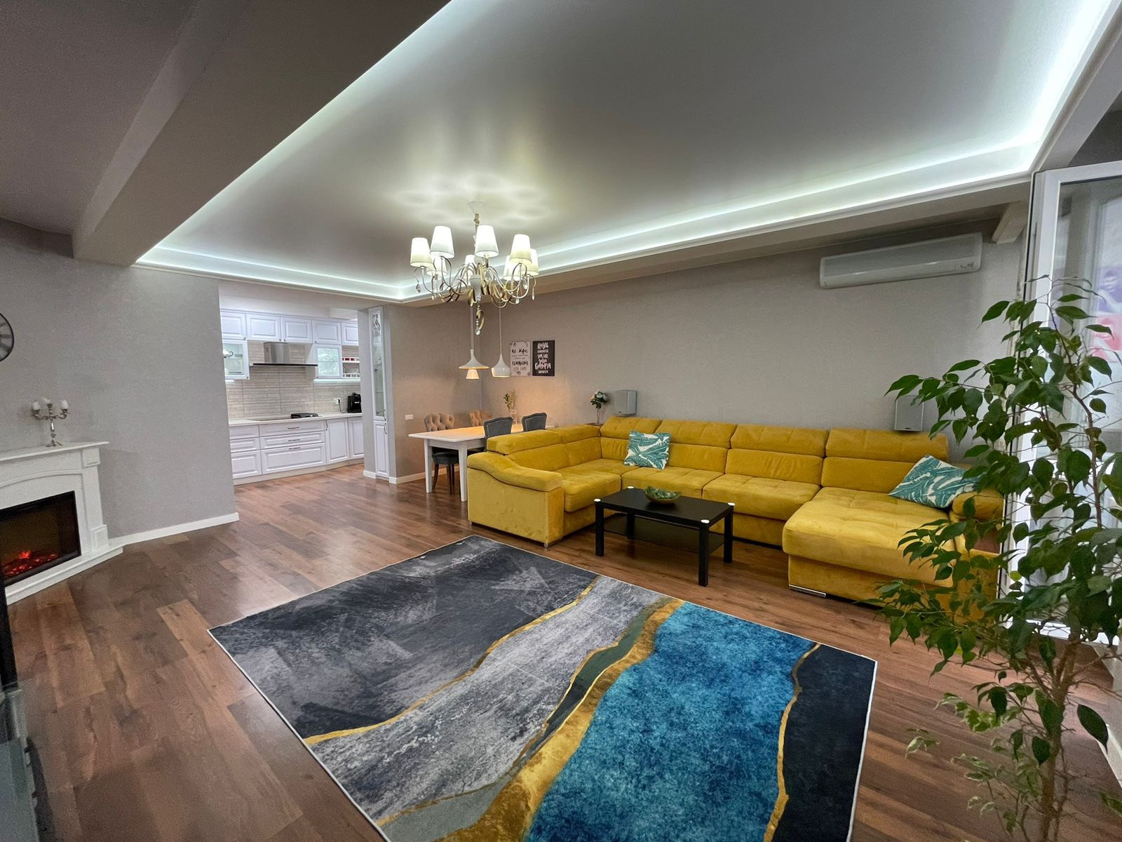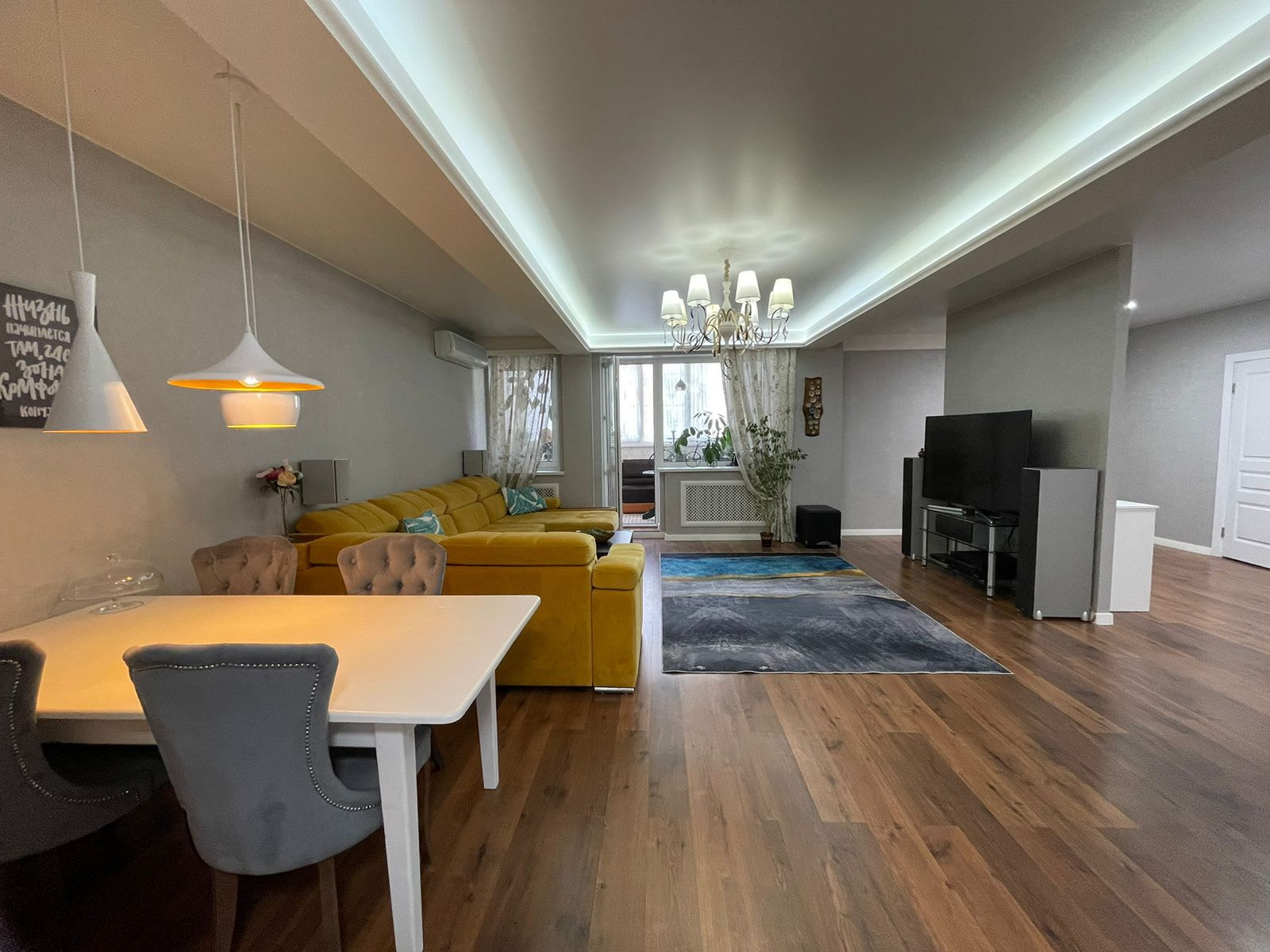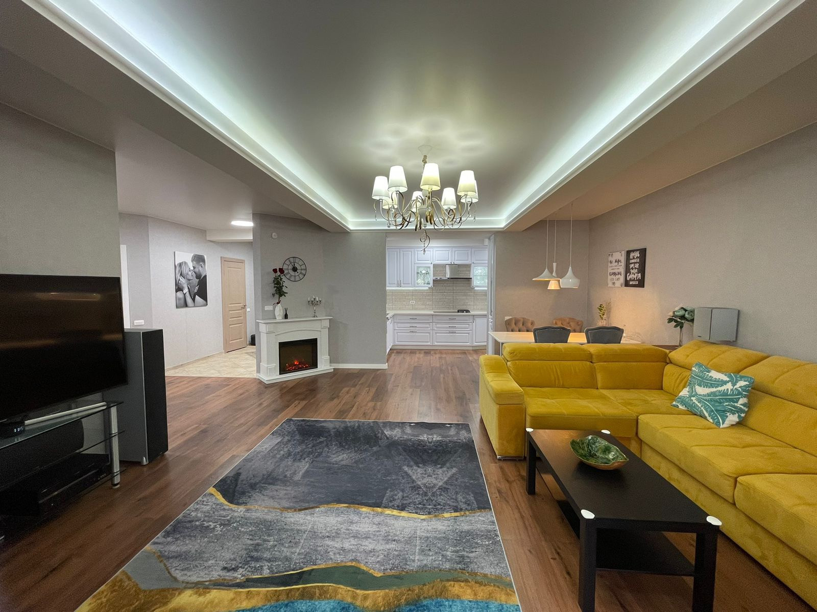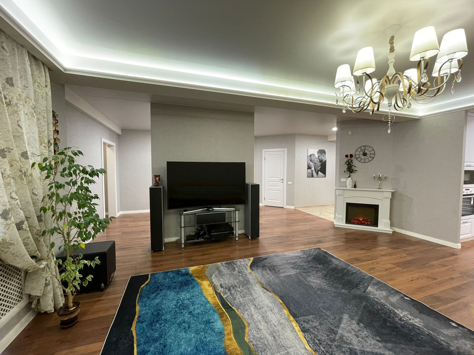 В квартире сделан дизайнерский ремонт, натяжные потолки, ламинат, электрокамин, кондиционер.