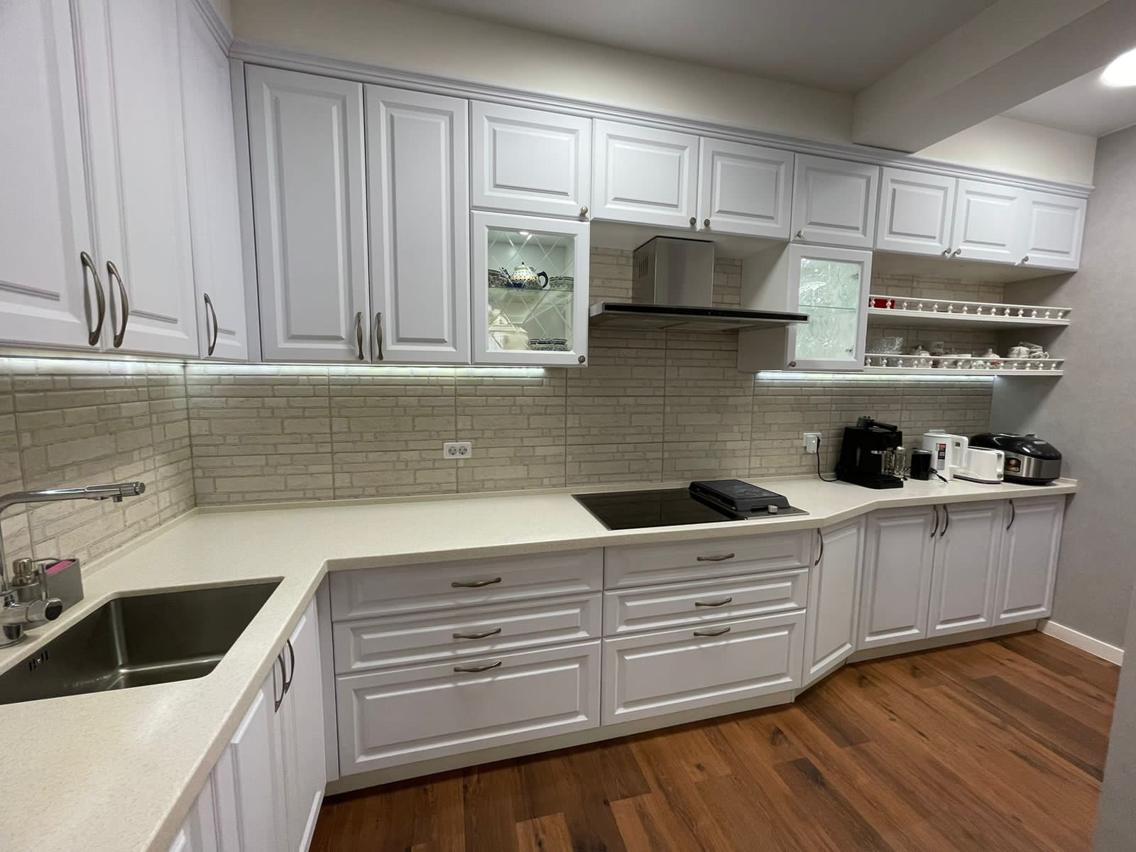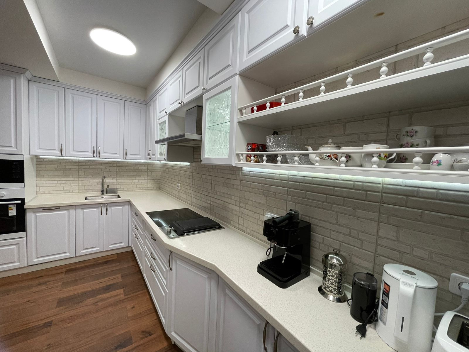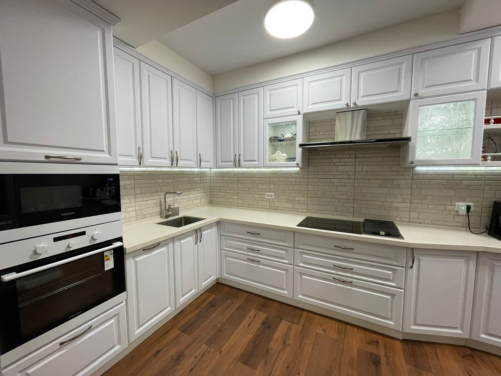 Кухня-гостинная: полностью мебелированная, кухонный гарнитур, варочная панель, духовой шкаф, посудомоечная машина, вытяжка, обеденная группа. Сделано зонирование освещения. Выход на лоджию.