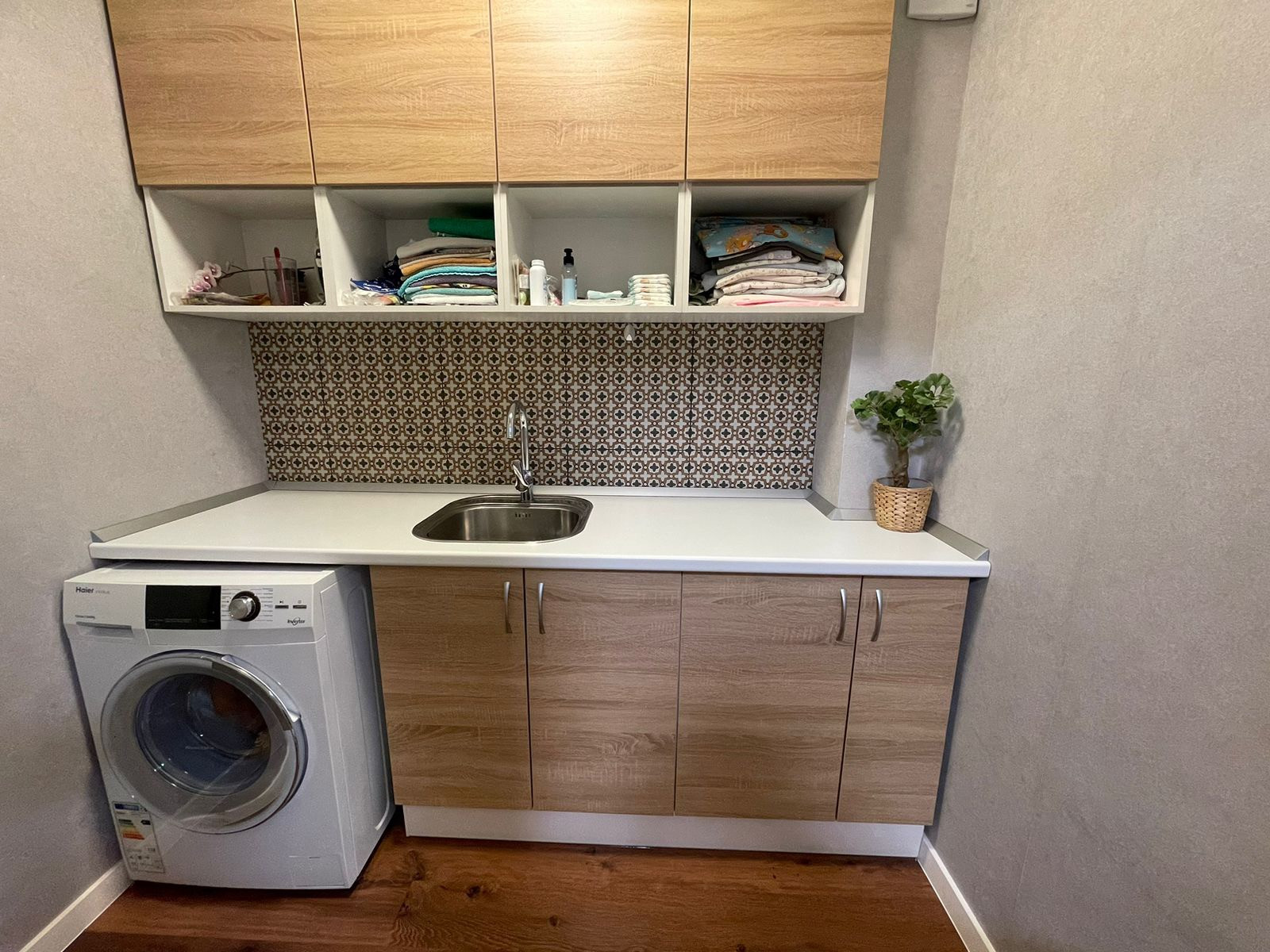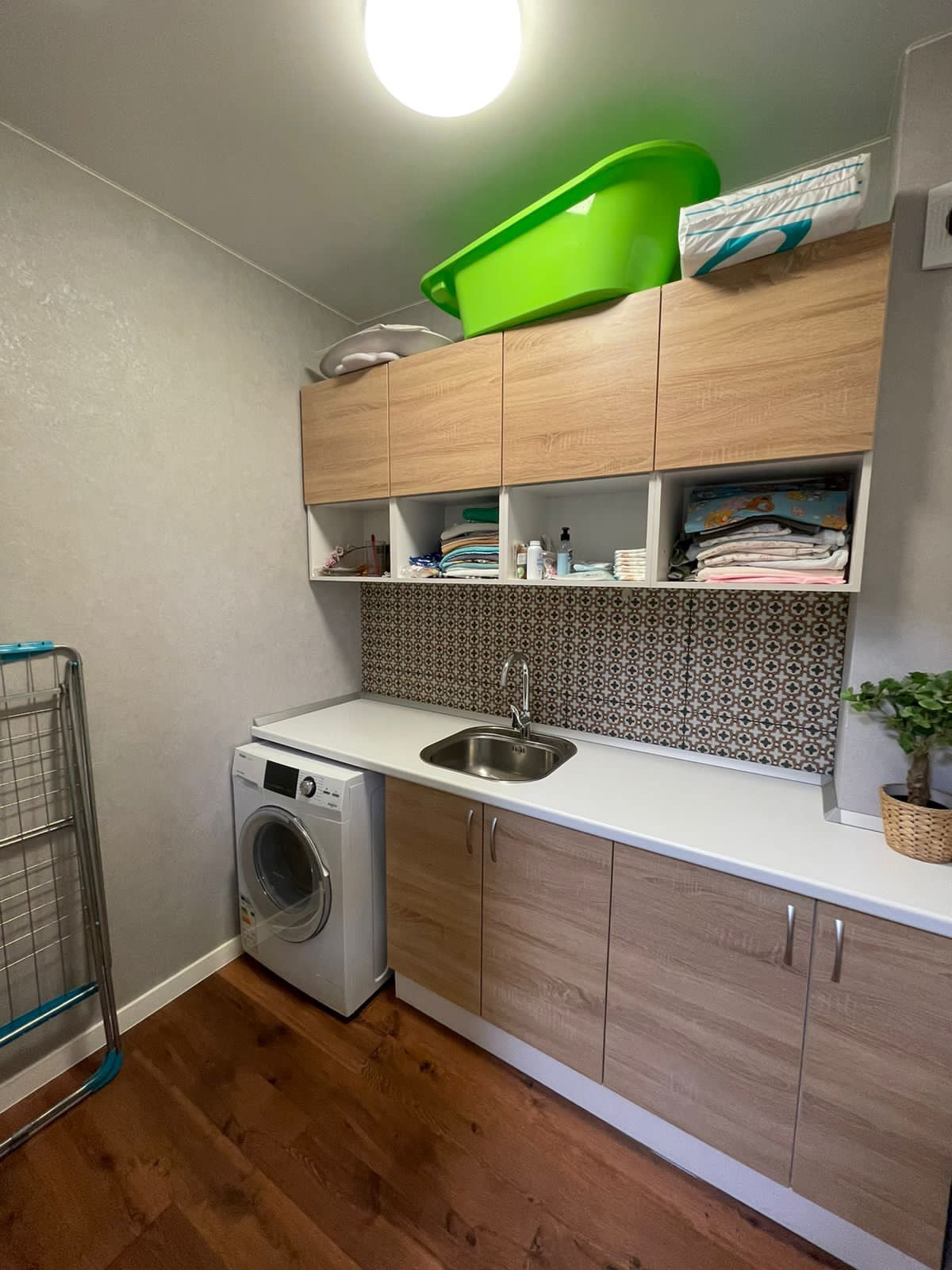 Постирочная: стиральная машина, раковина со смесителем и шкафчики для хранения.