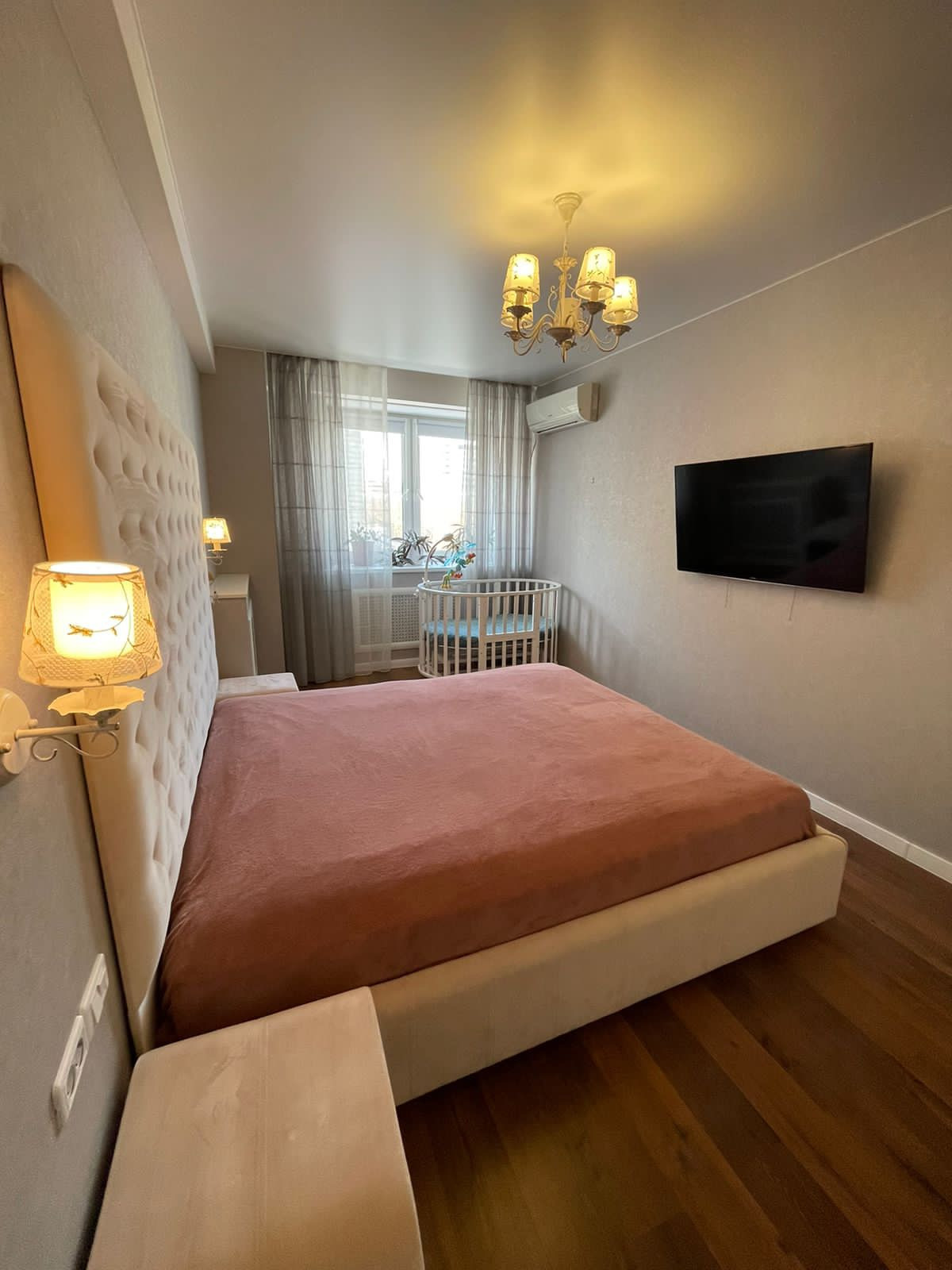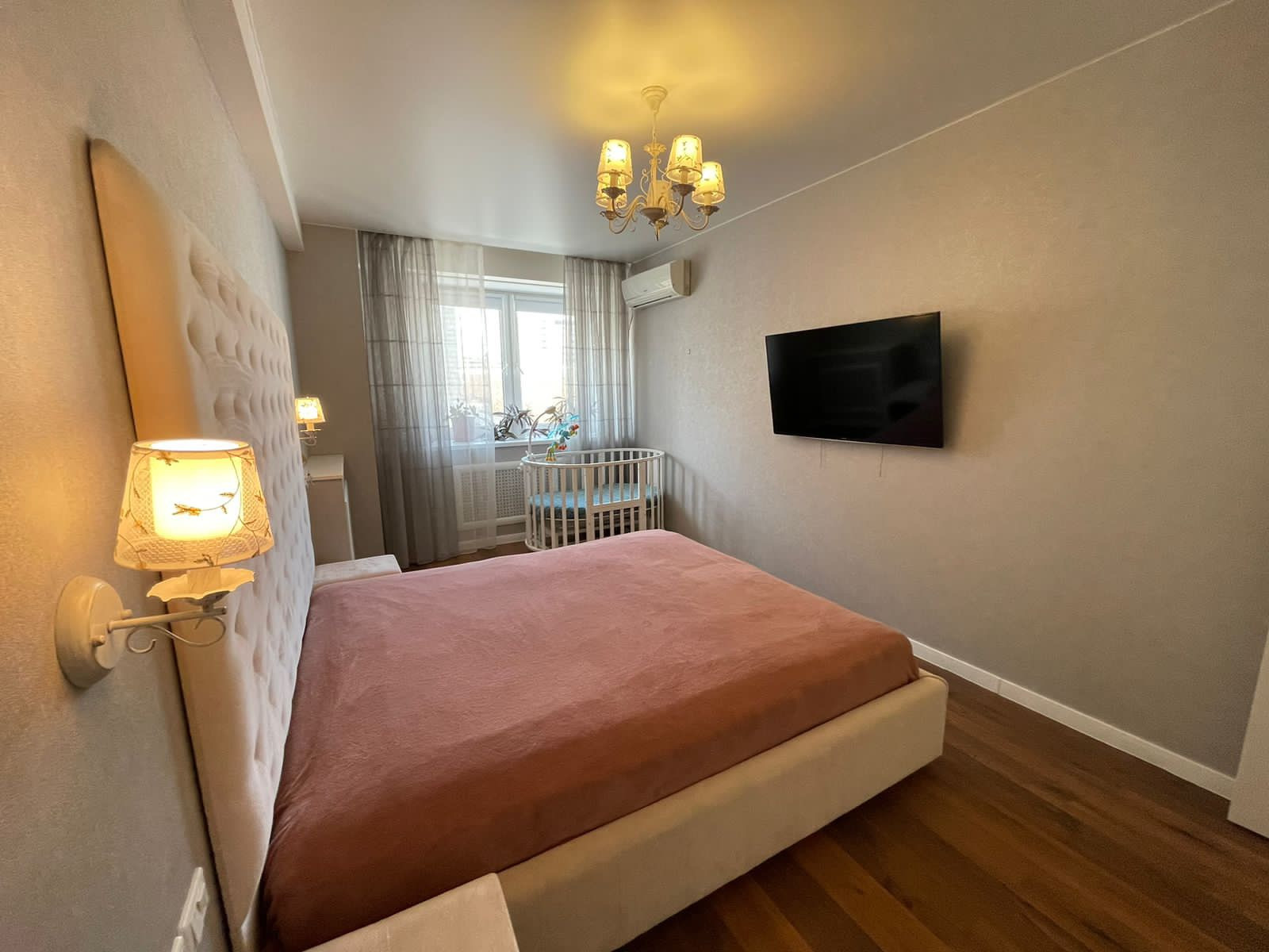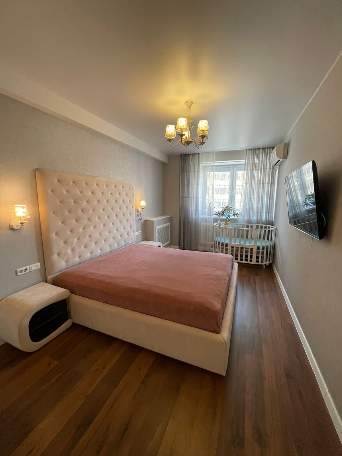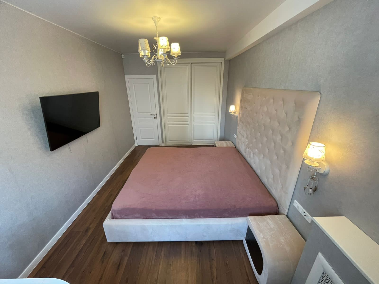 Спальня: сделана в светлых тонах. Кровать с большим изголовьем.встроенный шкаф.