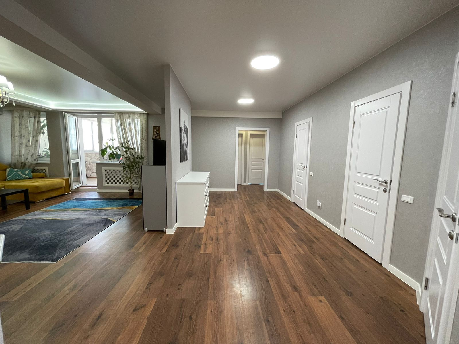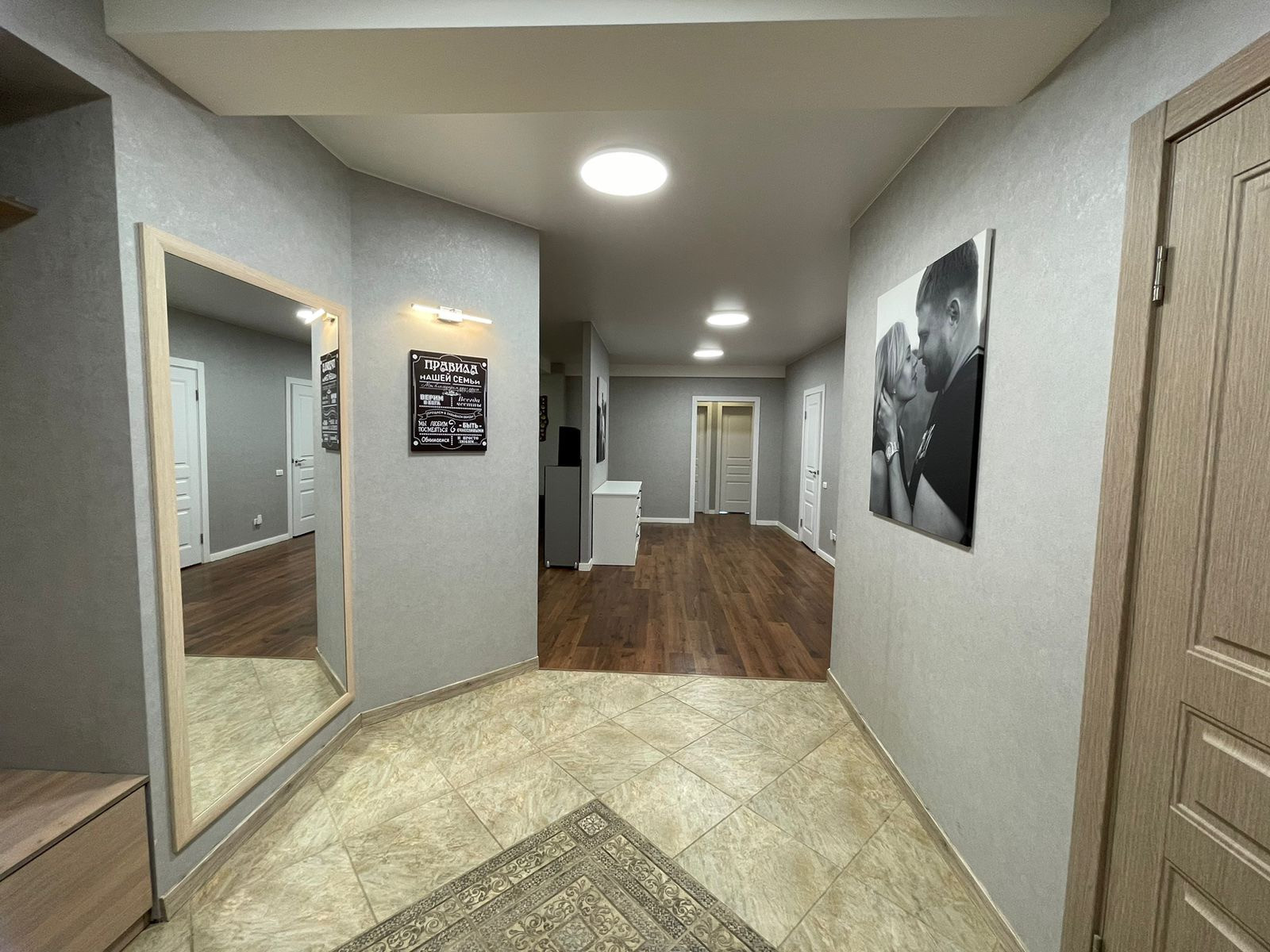 Теплые полы расположены на лоджии и в зоне коридора, санузла. Сделана шумоизоляция в комнатах. В квартире сделано зонирование световых зон.