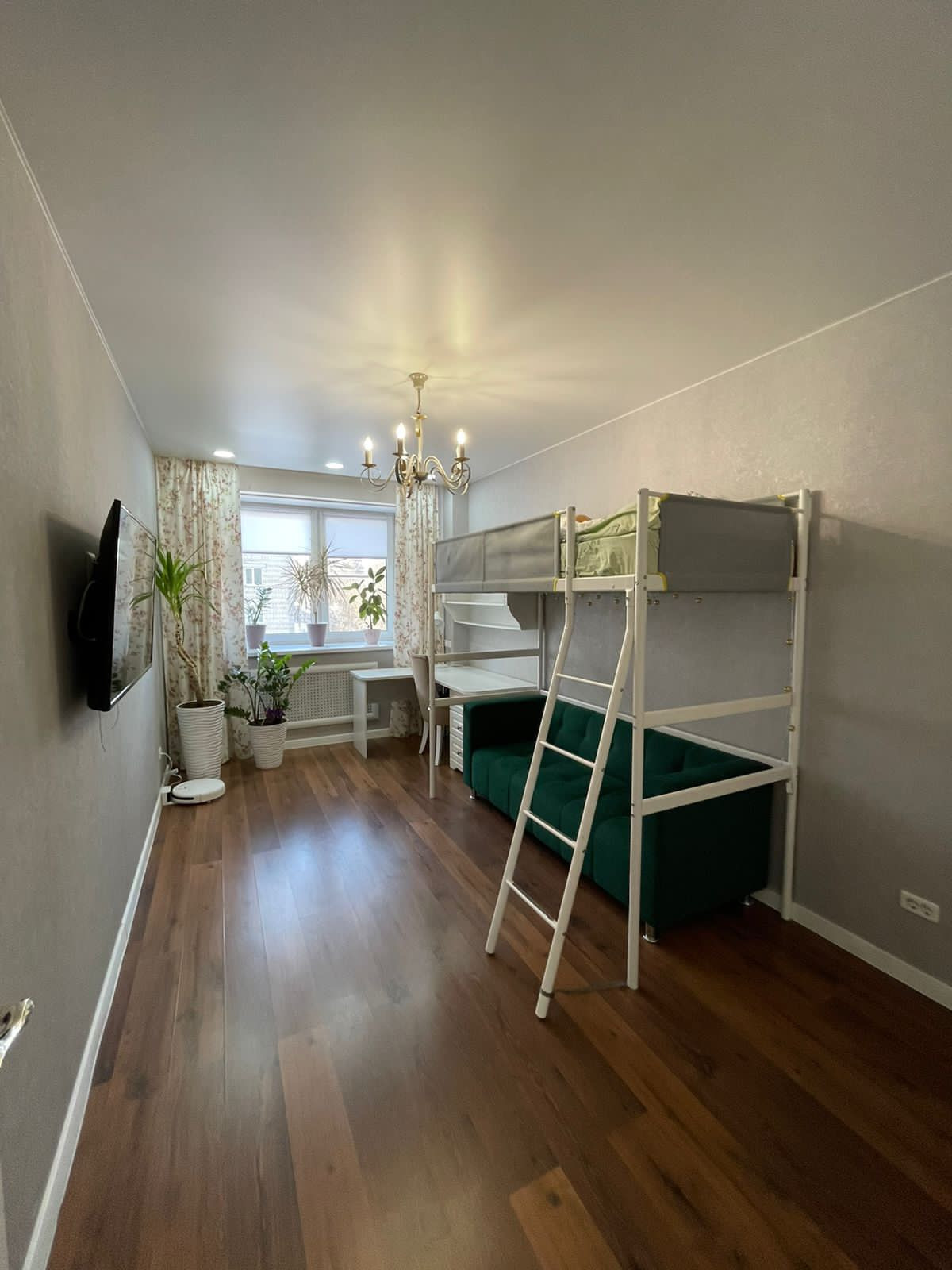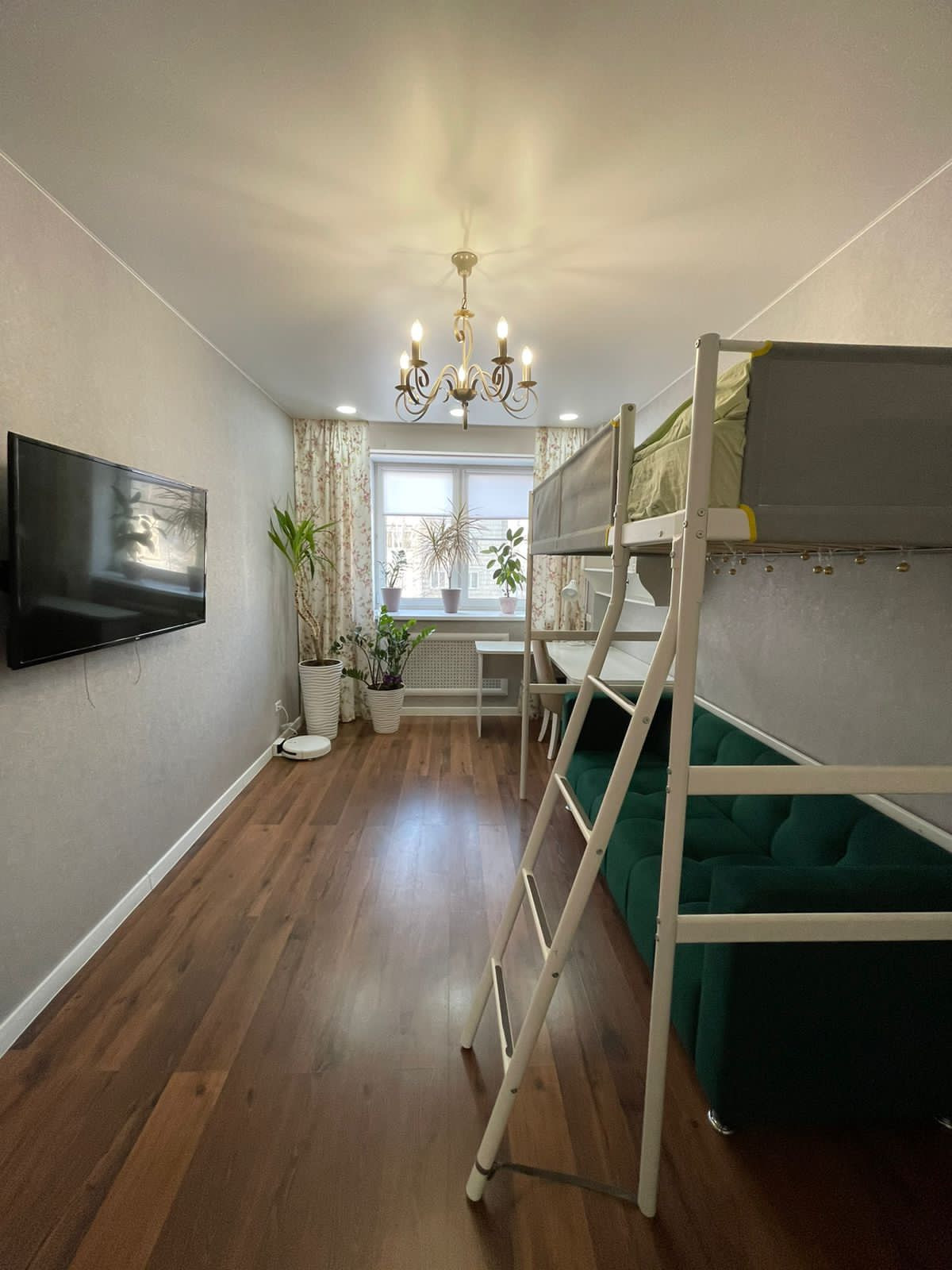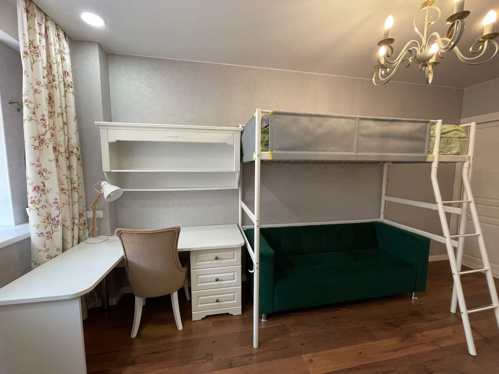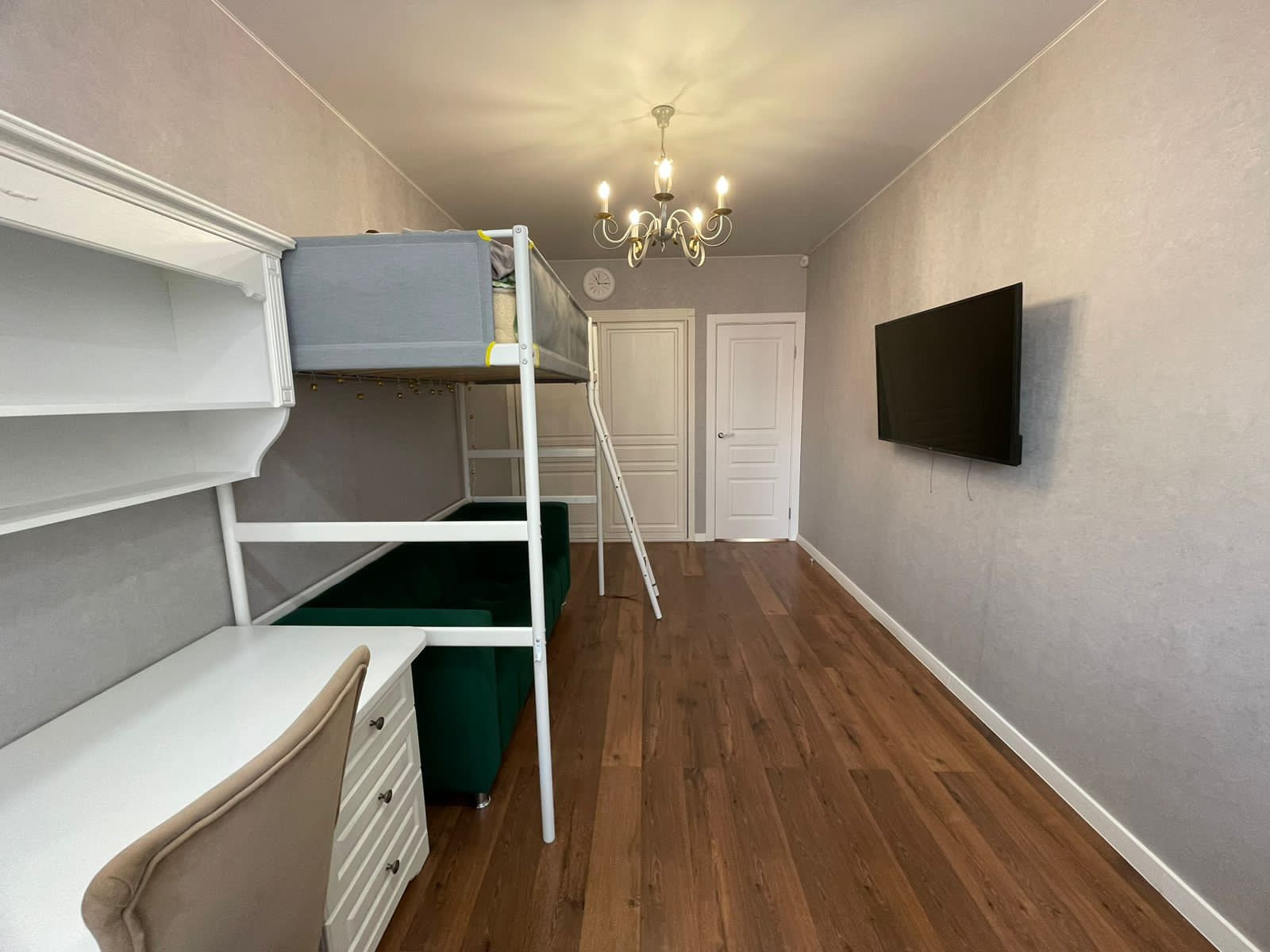 Детская комната: двухъярусная детская кровать, письменный стол, встроенный шкаф для одежды.