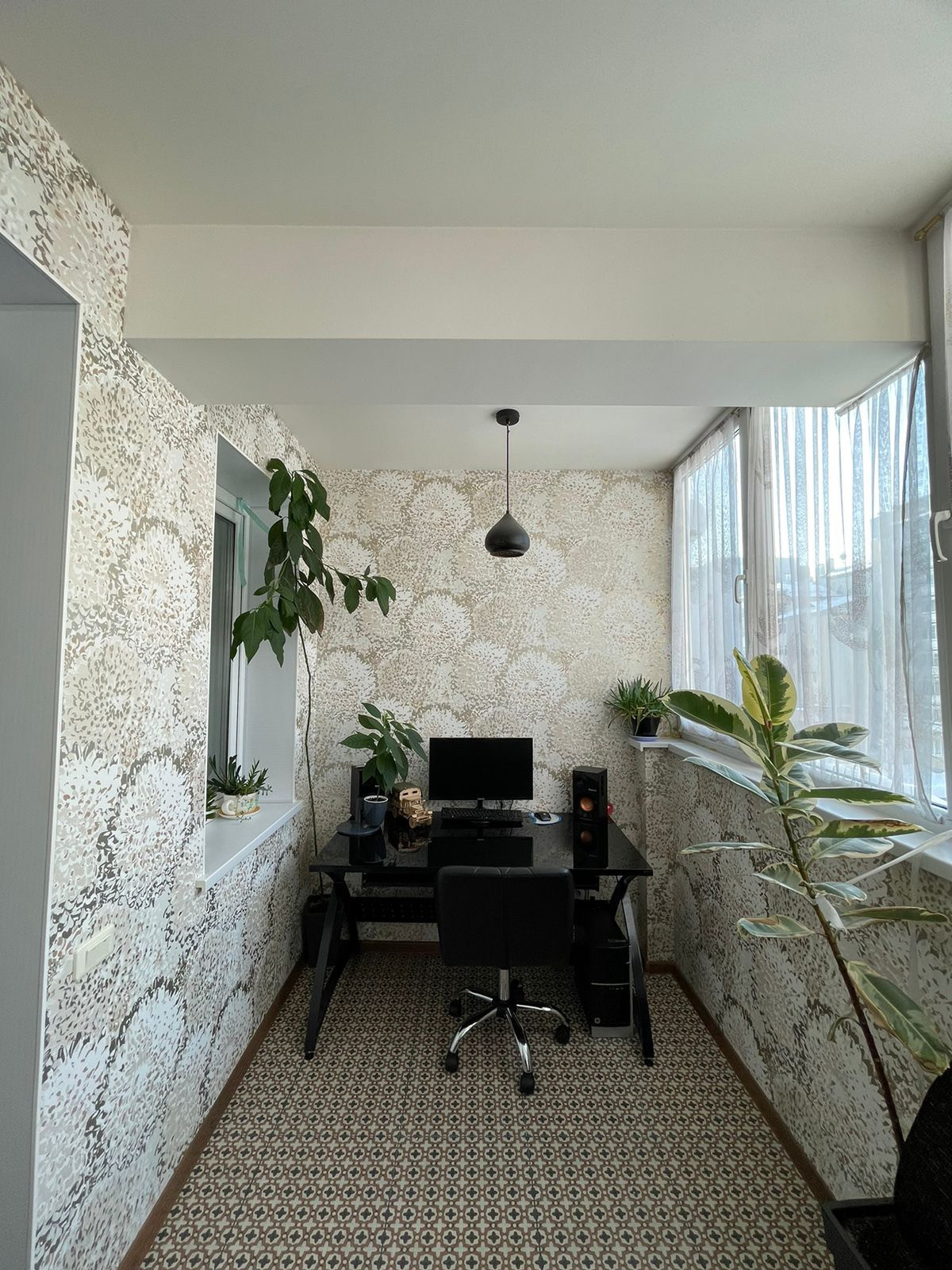 Лоджия: утеплена и остеклена, сделана под рабочее место с небольшой зоной для отдыха.