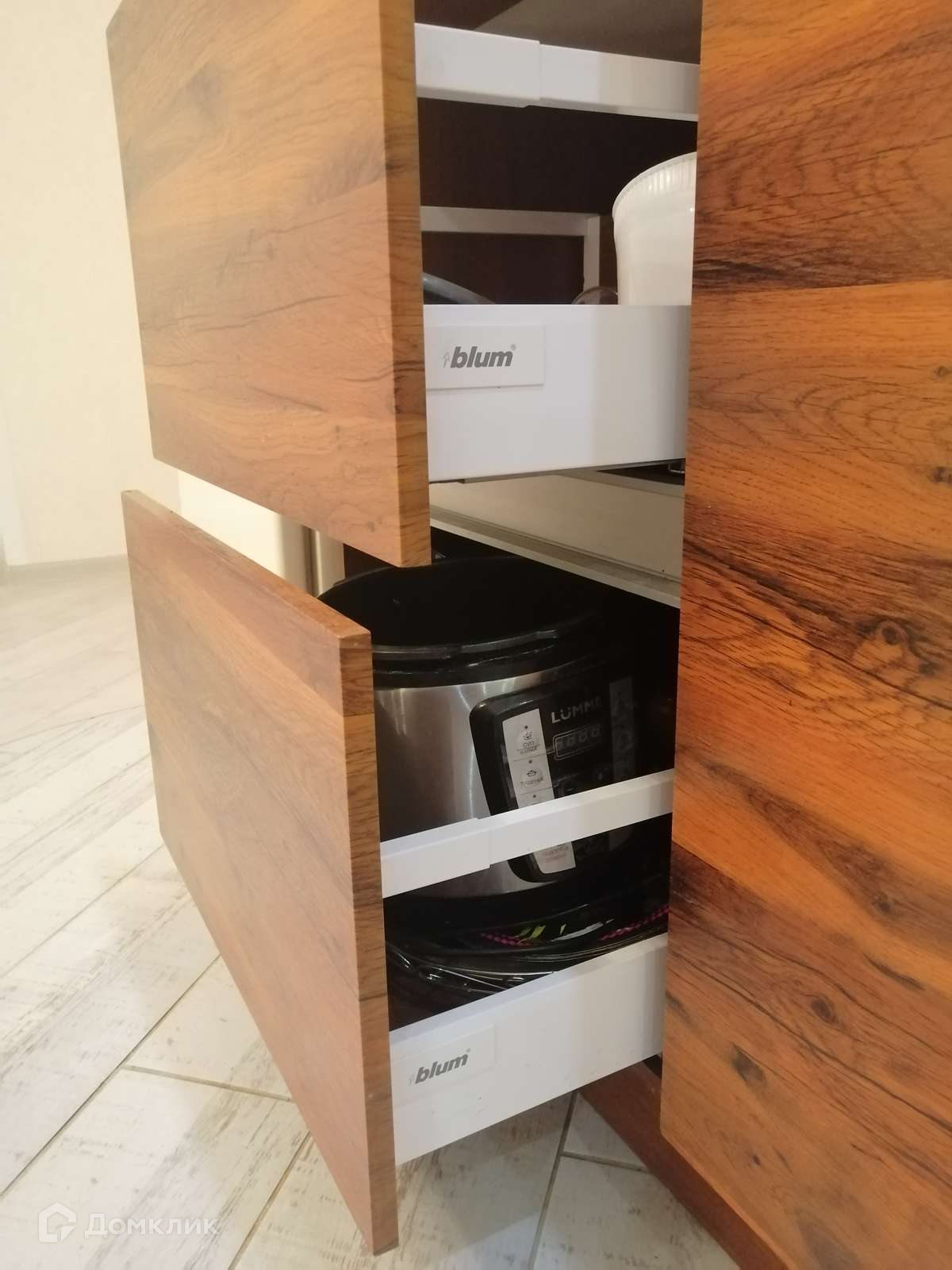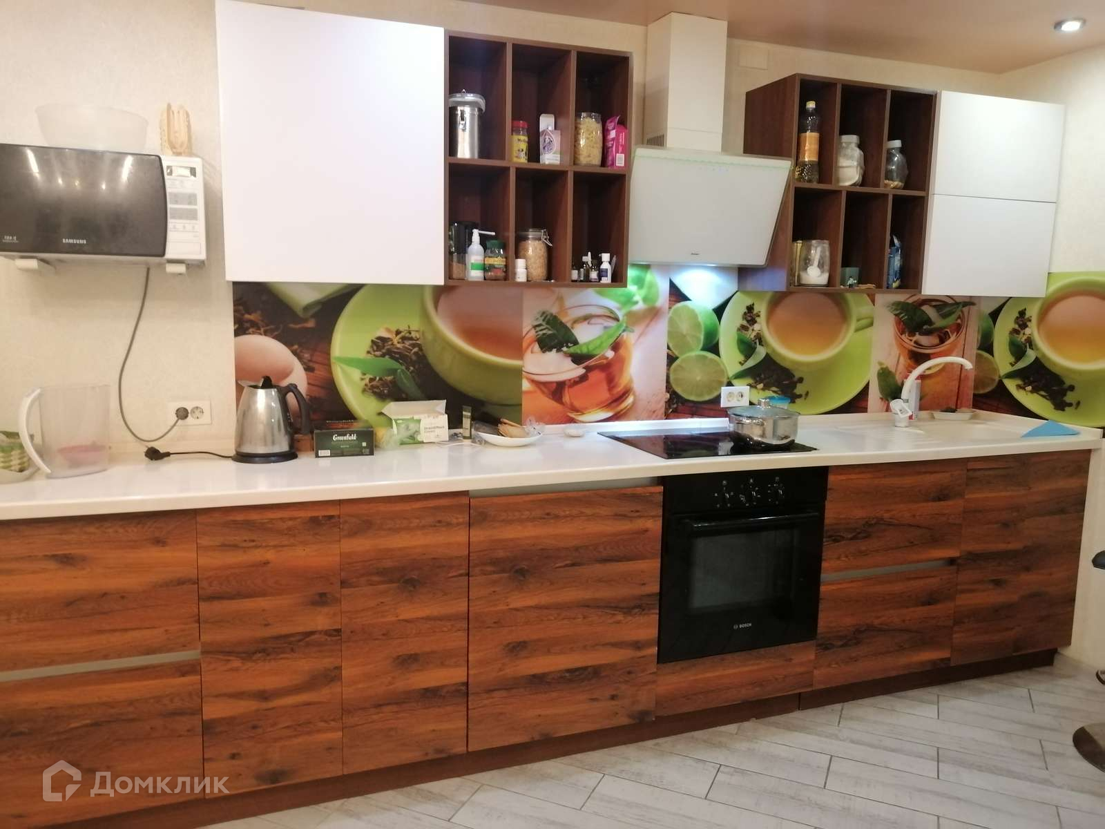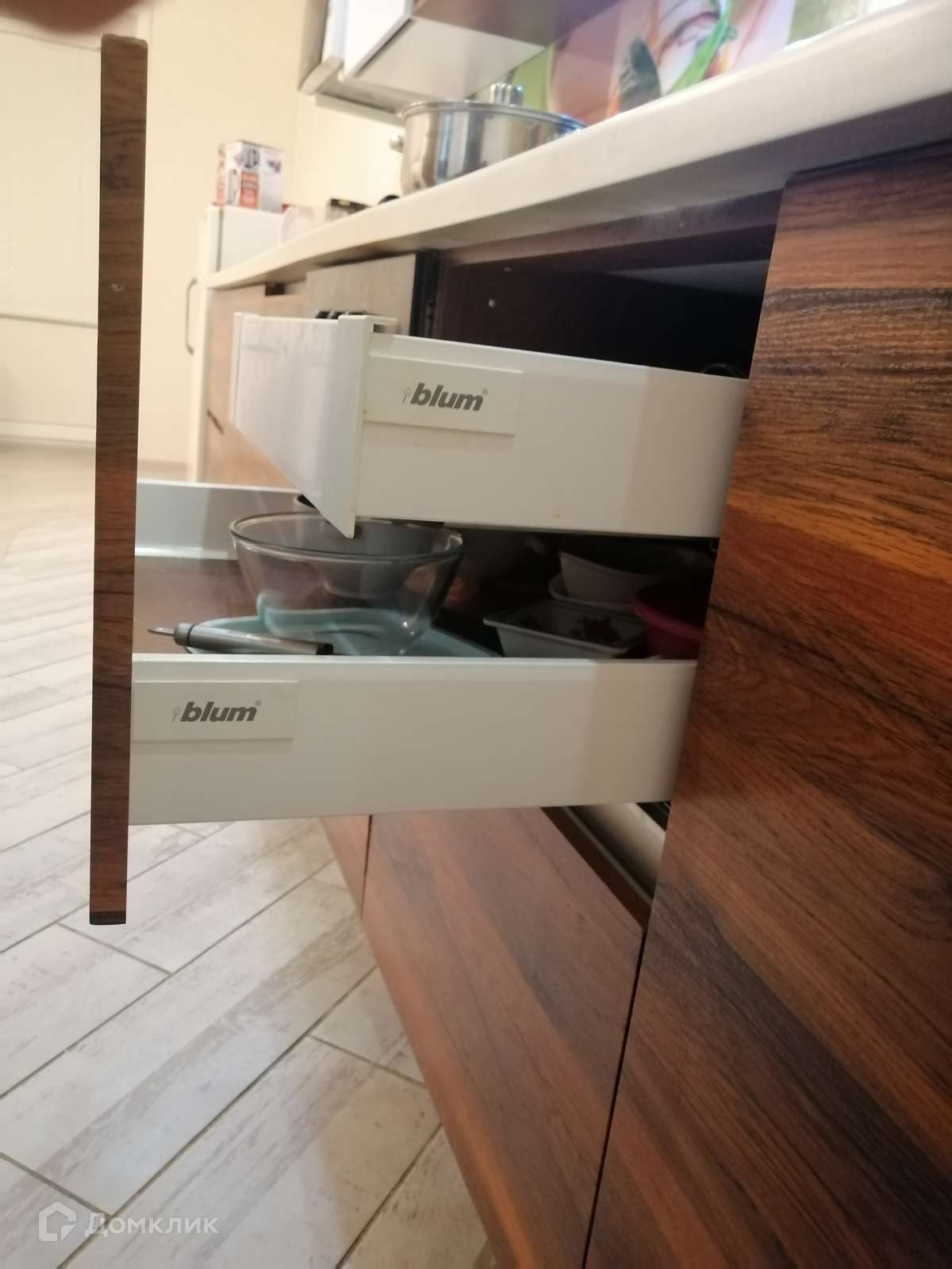 Установлена дорогая кухня, каменная столешница с влитой мойкой, двери с доводчиками, система открывания фасадов Blum.
