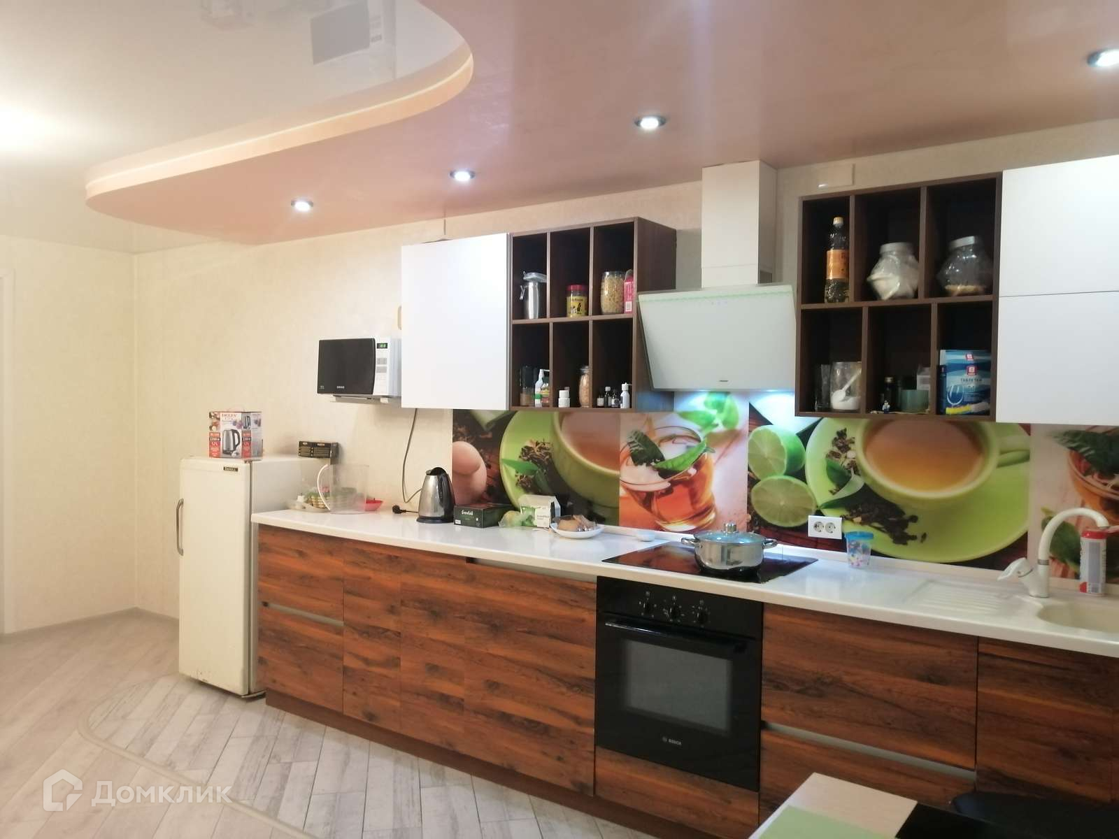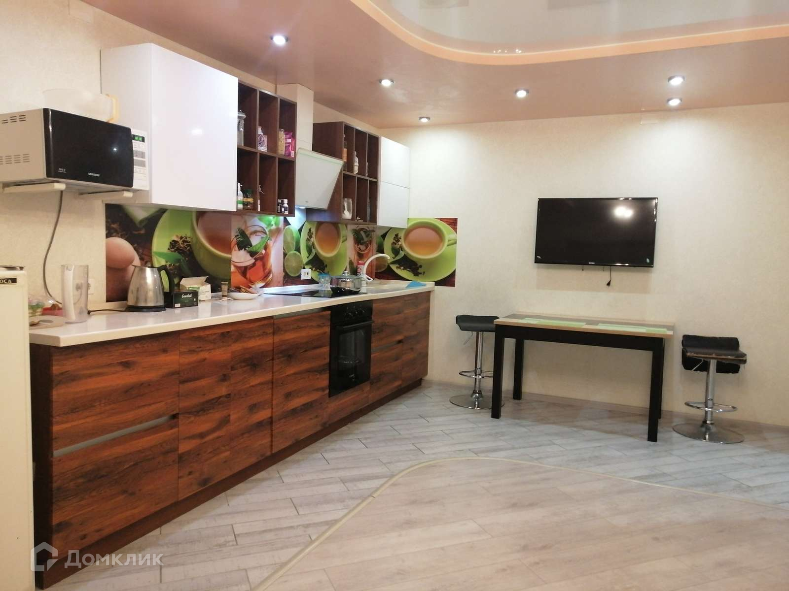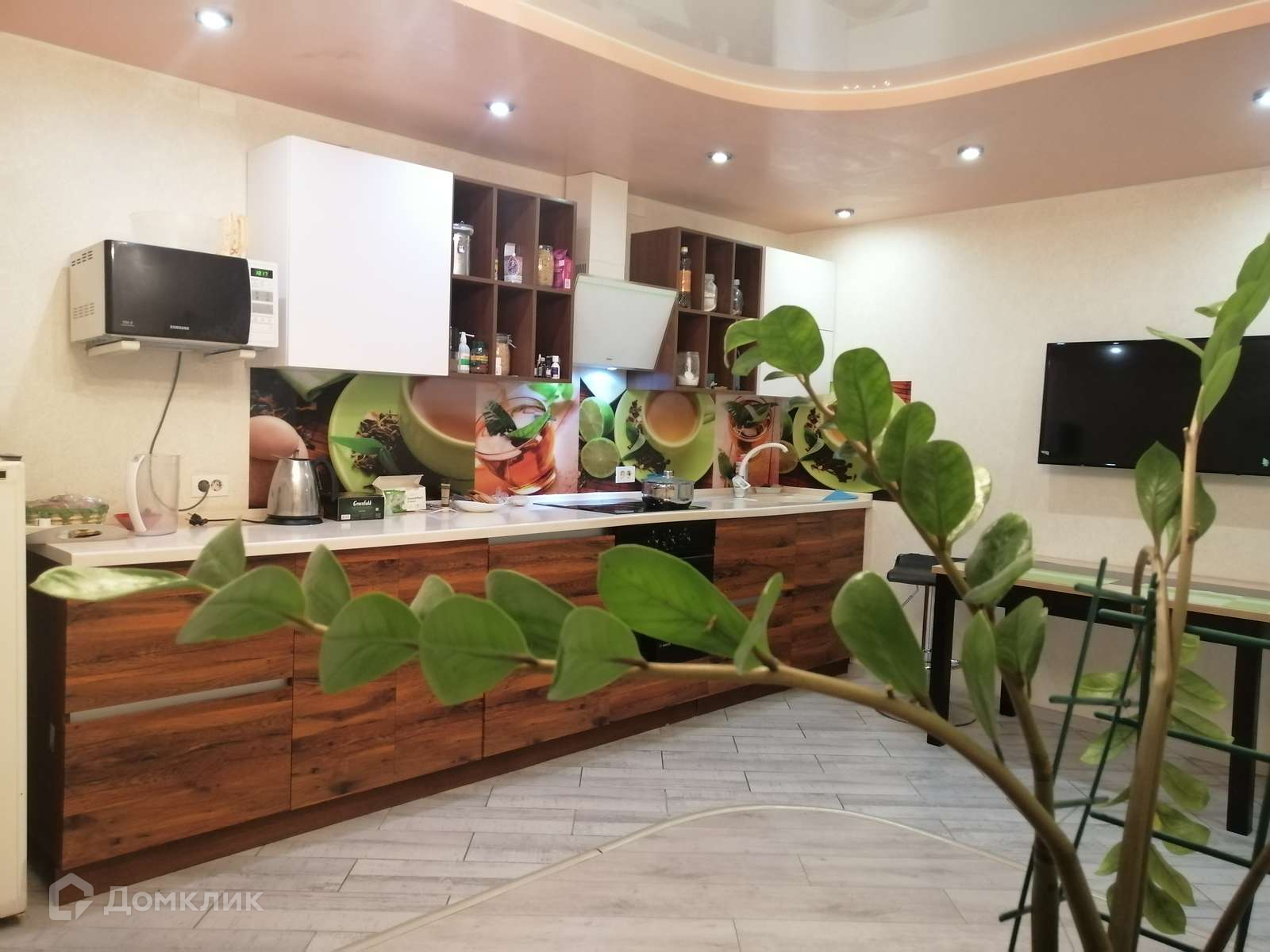 Установлена дорогая кухня, каменная столешница с влитой мойкой, двери с доводчиками, система открывания фасадов Blum.