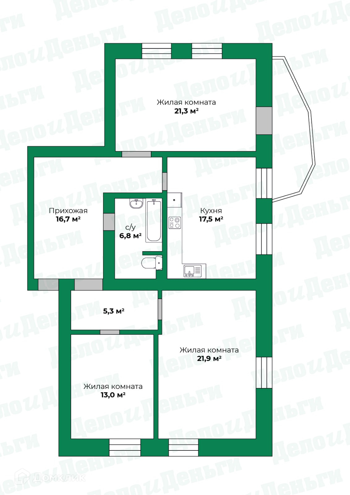 Просторные комнаты (21.3+21.9+13.0 кв/м)