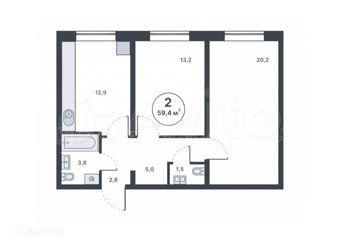 Общая площадь 59.6 м2