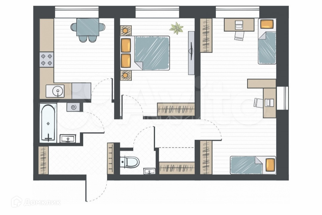 -отличная планировка с большой кухней, двумя просторными комнатами и двумя санузлами