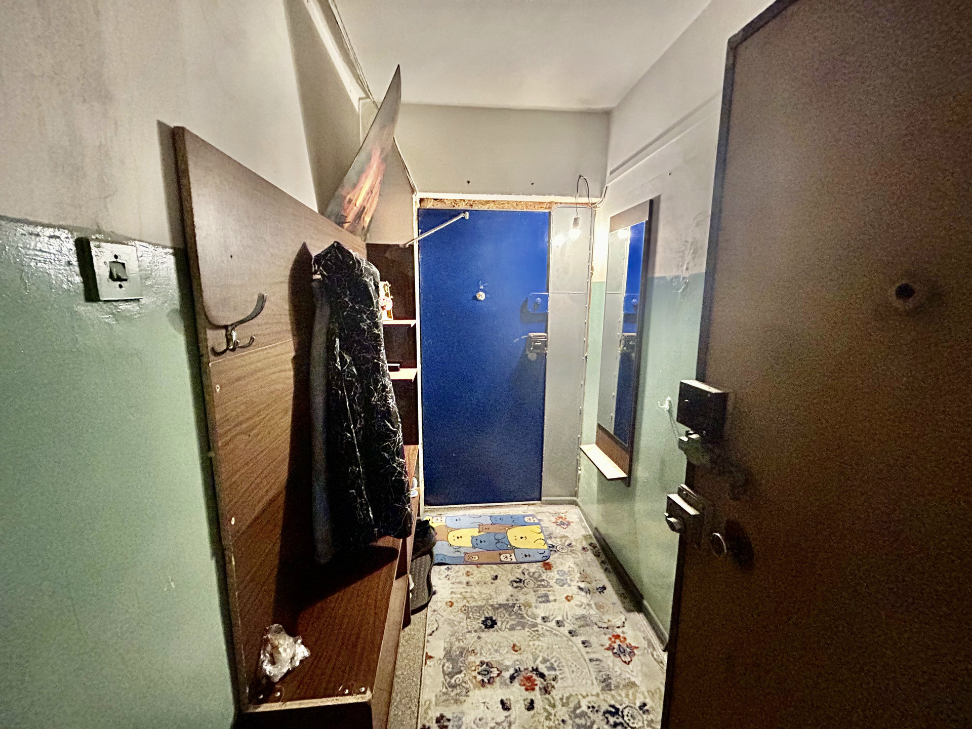 При входе в квартиру тамбур с местом для хранения вещей на две квартиры.