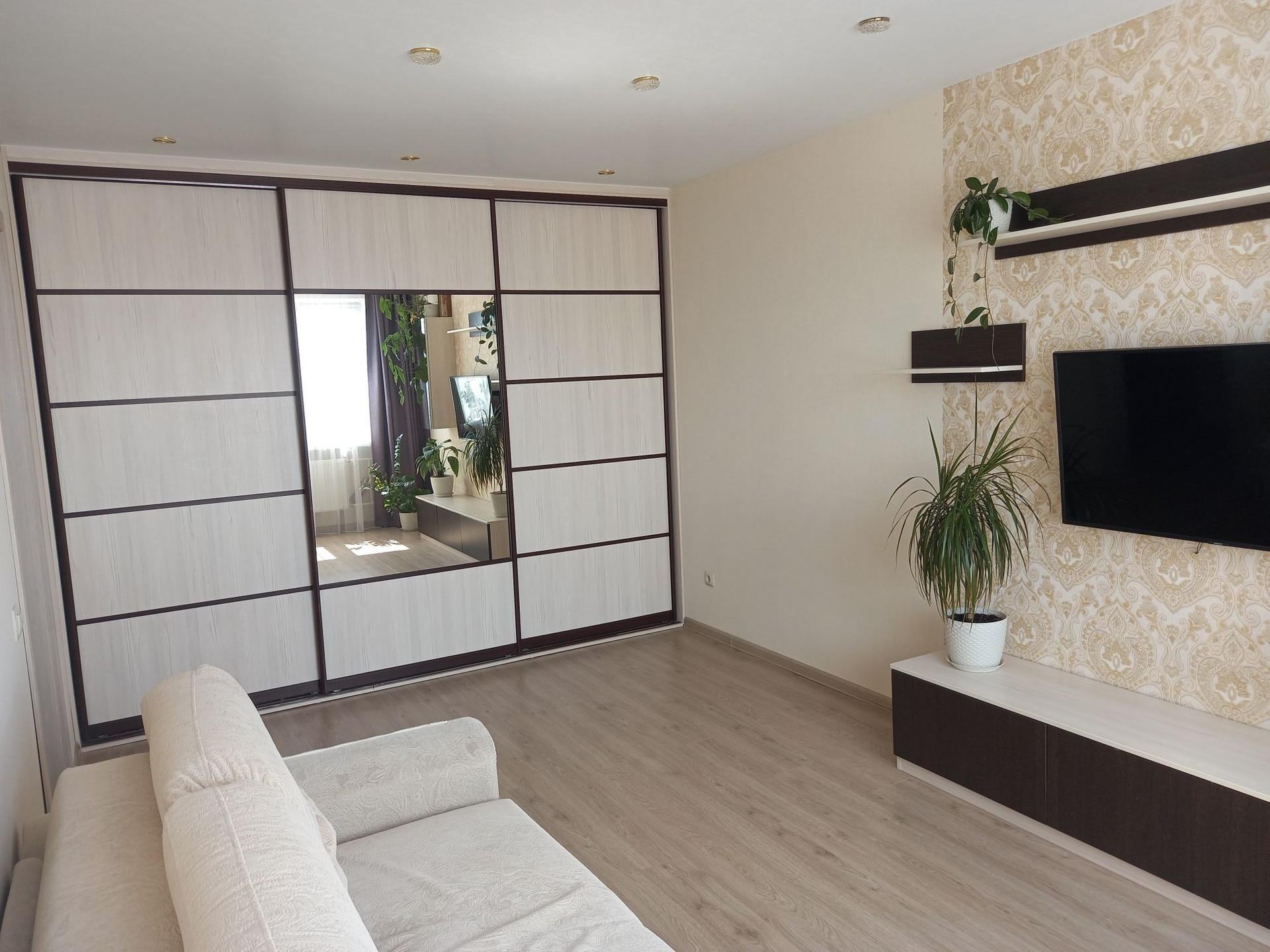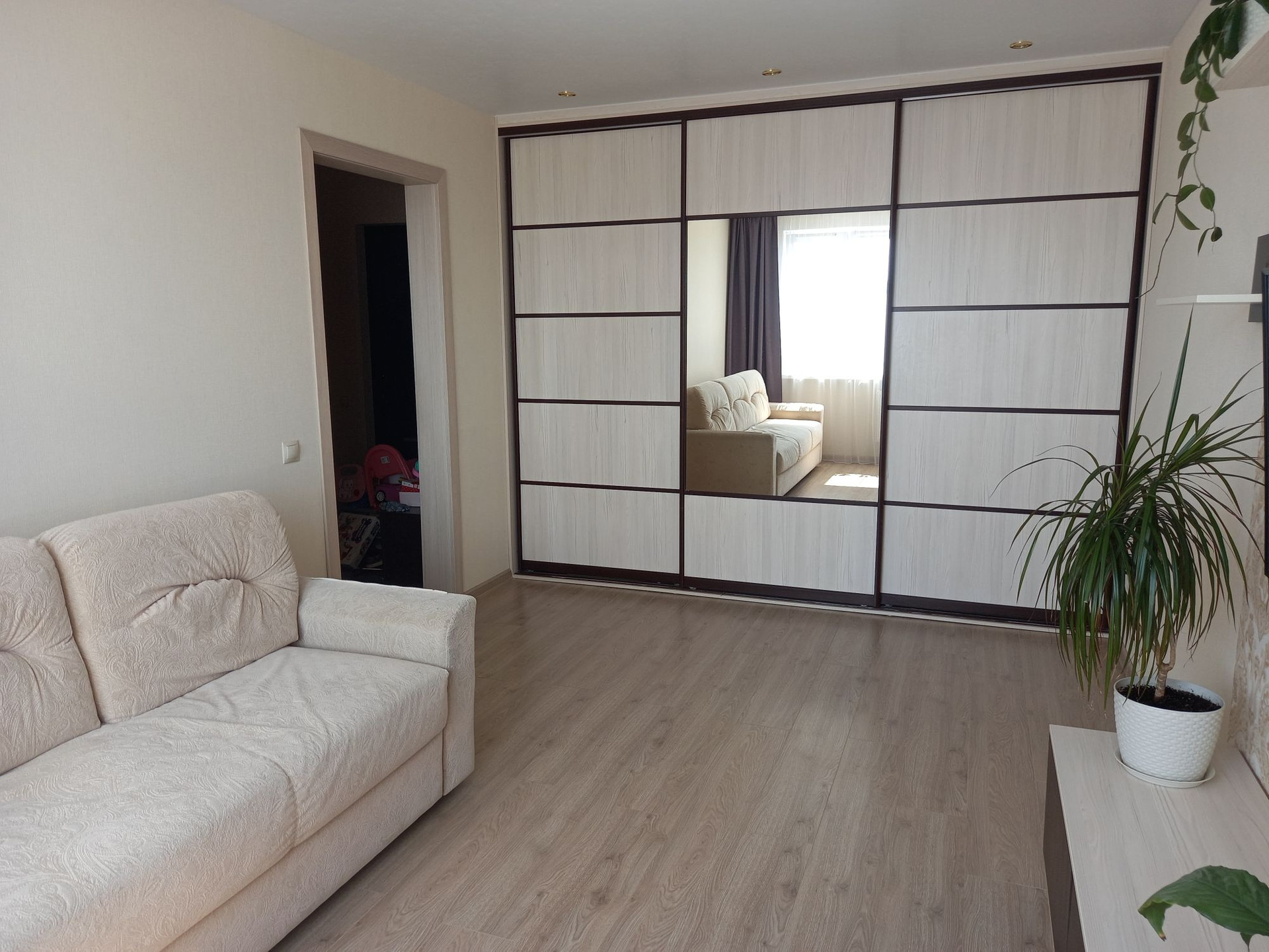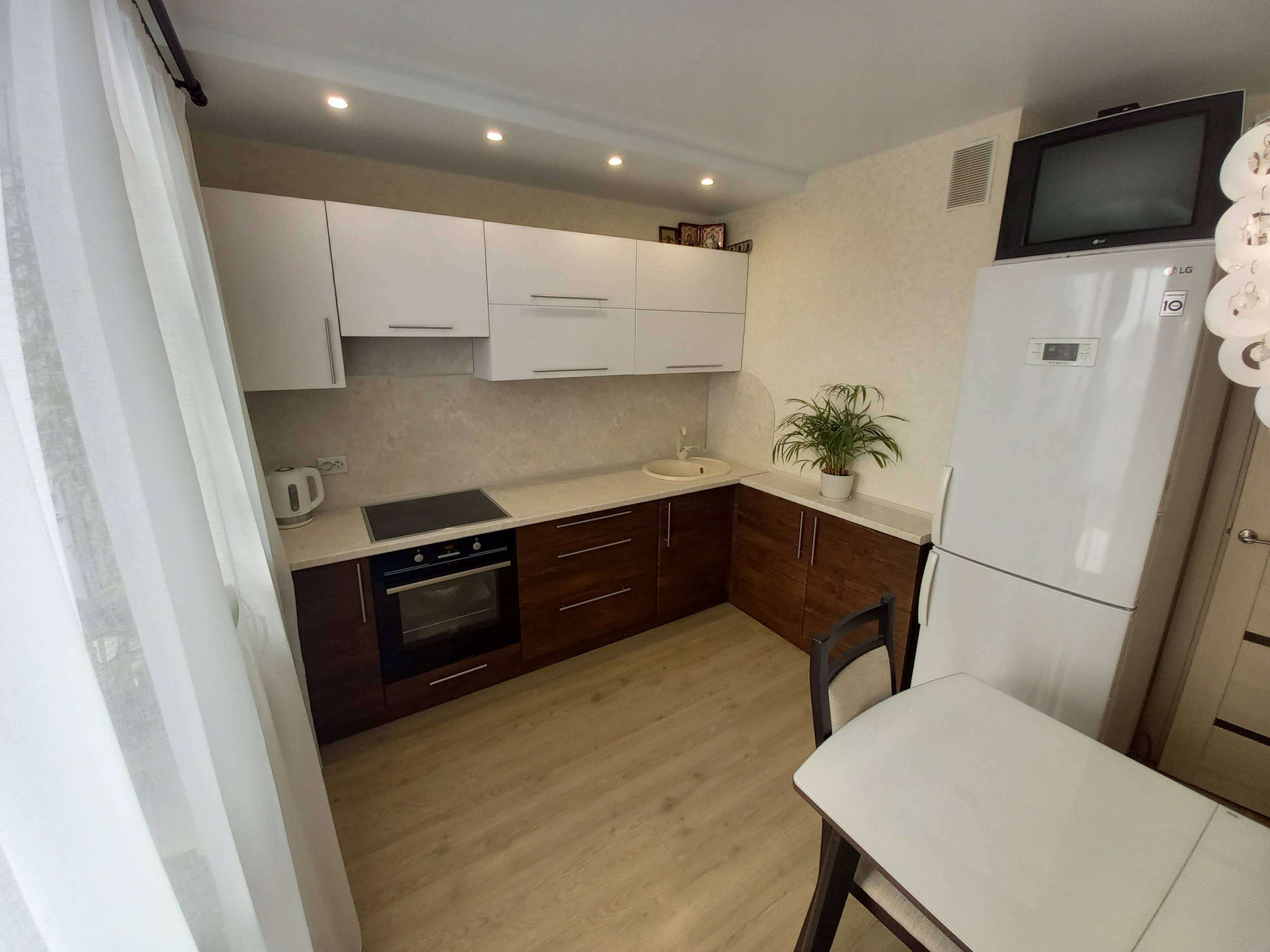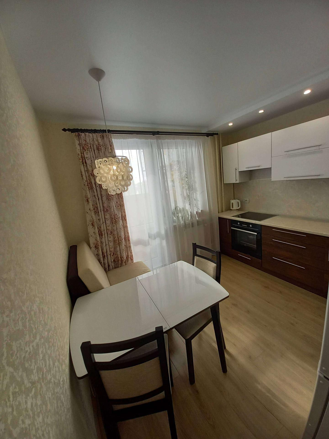 Новым хозяевам остаётся кухонный гарнитур со встроенной бытовой техникой, варочной панелью и духовым шкафом и вся корпусная мебель.